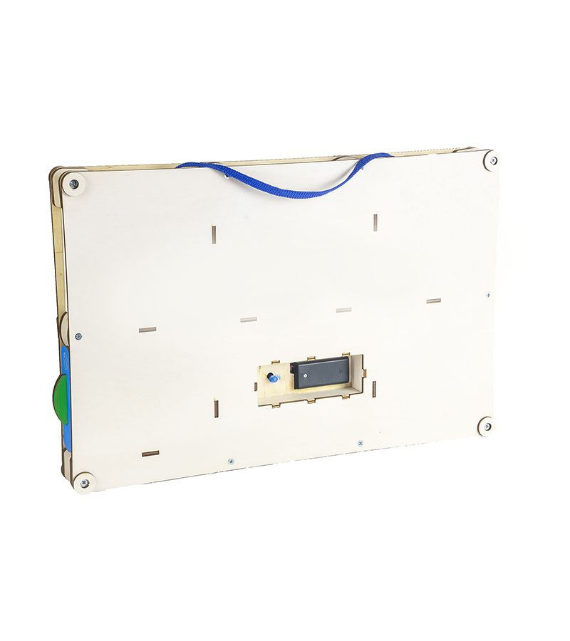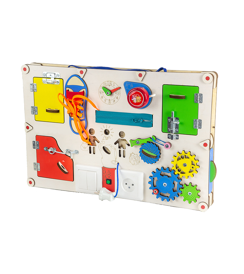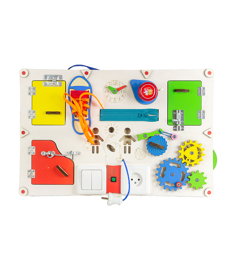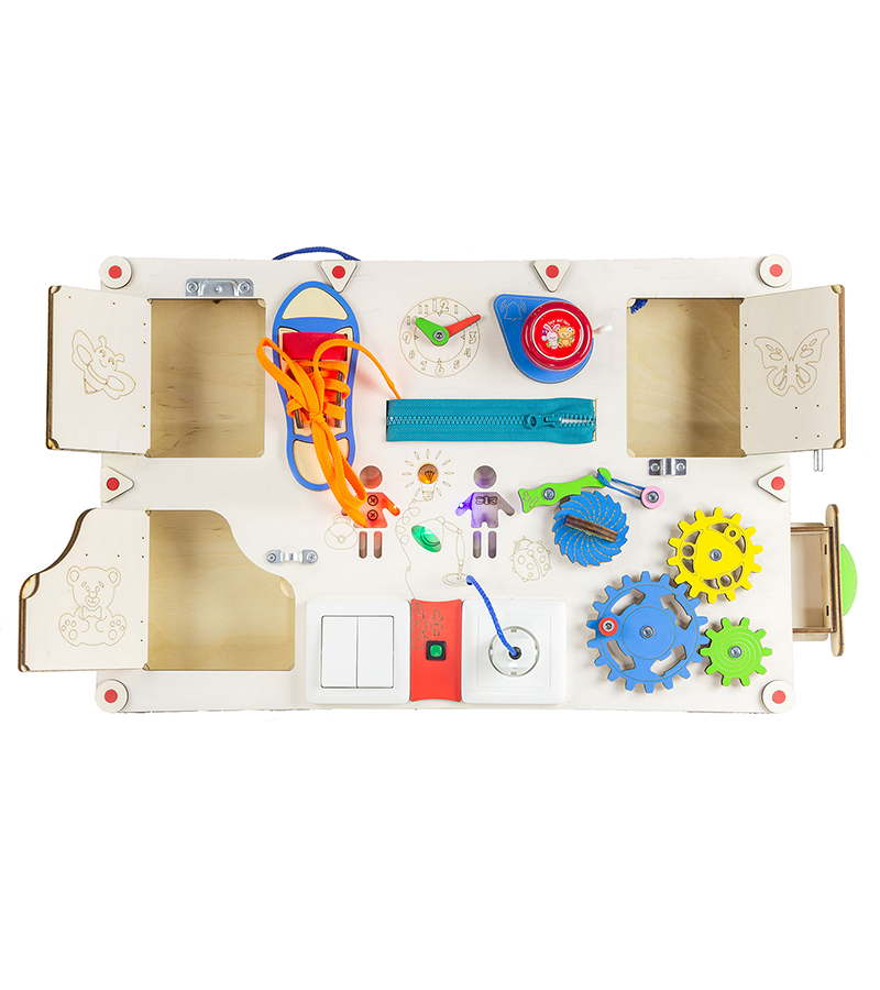 На бізідошці розміщені дверцята, за якими можна розміщувати картки для вивчення. Також на дошці є годинник, який допоможе дитині вивчити цифри. Крім цього, різноманітні замочки, шестерінки, застібки та інші елементи дозволять малюкові освоюватися в навколишньому світі. Всього на дошці розташовано 11 ігрових елементів, які дозволять надовго зацікавити і захопити вашого малюка.