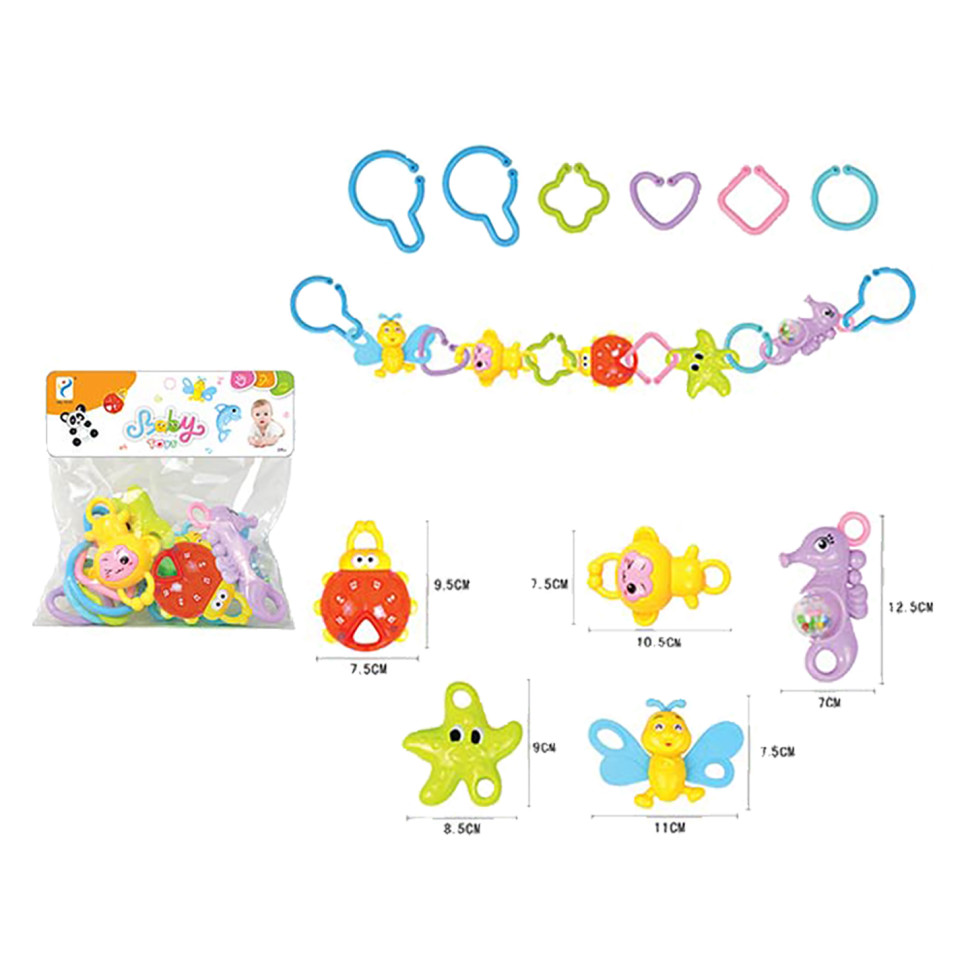 Іграшка виконана у вигляді милих тваринок, які можна поєднати за допомогою ланок в єдиний ланцюжок. Також частини брязкальця можна кріпити один до одного, завдяки скріплюючим деталям. Брязкальце сприяє розвитку тактильного сприйняття та навичок дрібної моторики.
