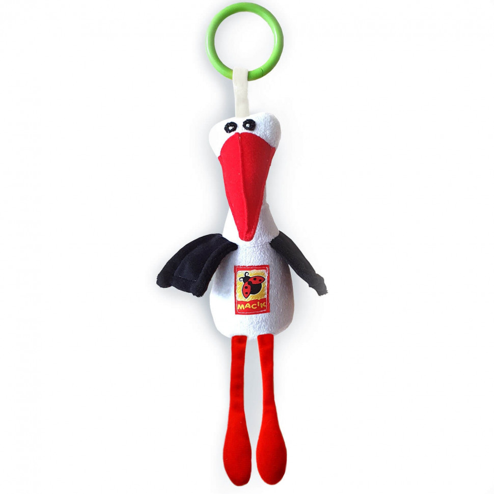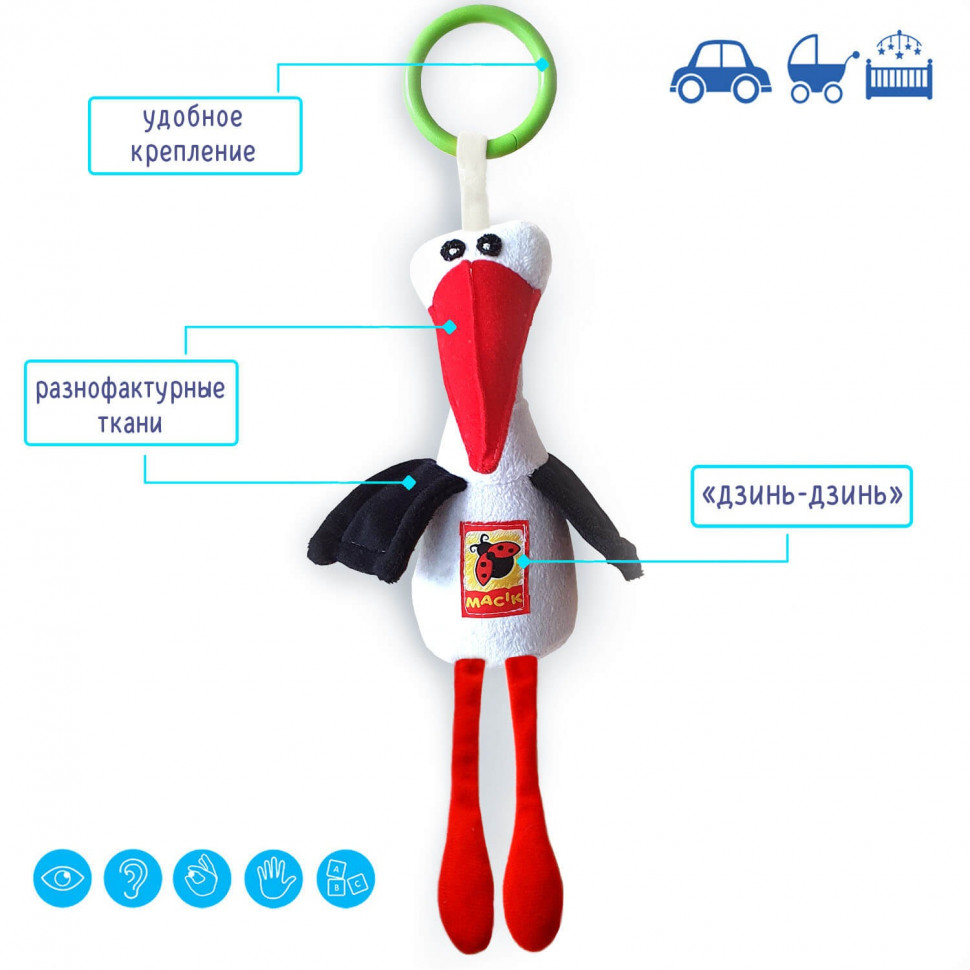 Спеціальне кріплення дозволяє зафіксувати іграшку на візку, ліжечку, розвиваючому килимку або автокріслі. З лелекою можна грати вдома, на прогулянці, в подорож.