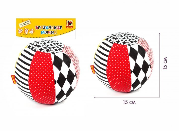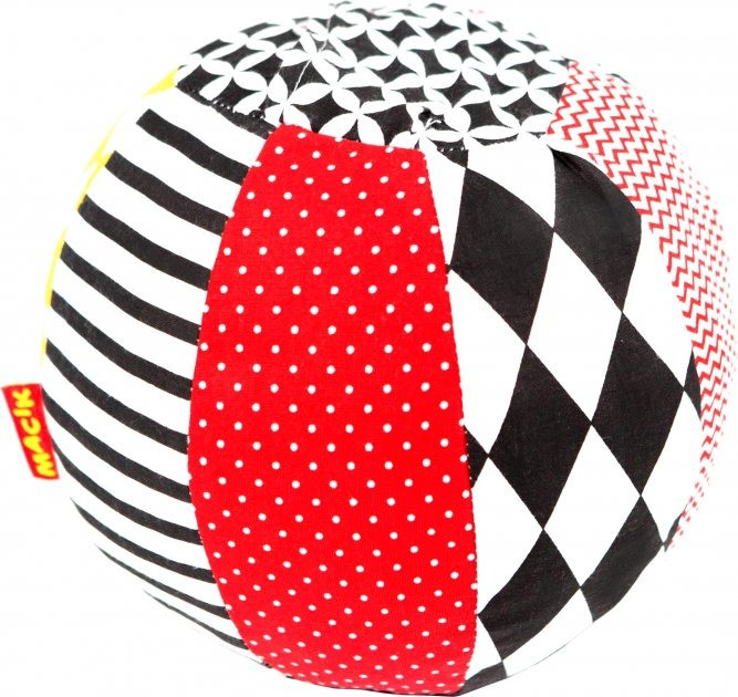 М'ячик-брязкальце серії Black & White TM Macik пошитий з натуральних тканин. Його контрастні зображення, лінії і фігури неодмінно зацікавлять малюка, адже їх так цікаво вивчати. А дзвінке брязкальце всередині подарує посмішку і радість. Гра з м'ячем навчить дитину координувати рухи, а контрастні зображення і брязкальце допоможуть малюкові в формуванні зору і розвитку слуху. М'ячик мякий і абсолютно безпечний для малюка! Іграшка прекрасно переносить щадне прання і швидко сохне. Склад: бавовняна тканина; швейна фурнітура; звукові елементи; холлофайбер. Розмір: 16 × 16 × 16 см. Розмір в упаковці: 23 × 17 × 16 см.