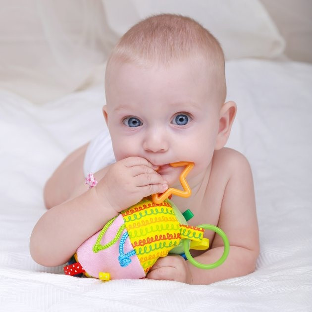 Розвиваючі елементи: різнокольорові петельки, елементи, що шелестять, пищалка, гремелки, «смачні» вузлики і колечка.