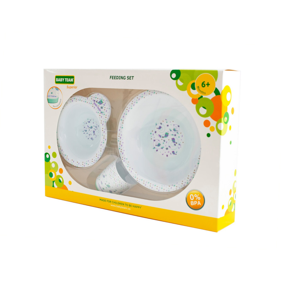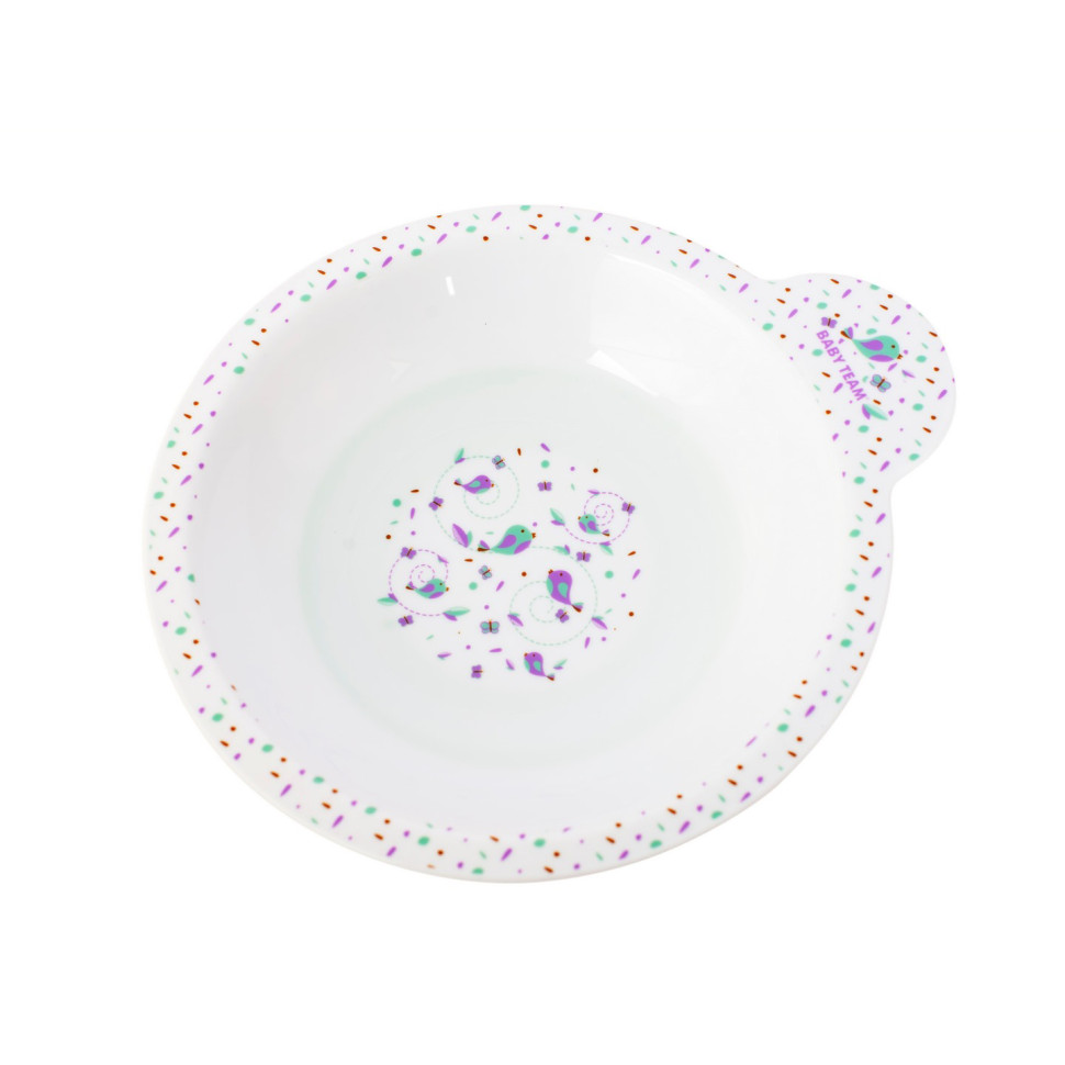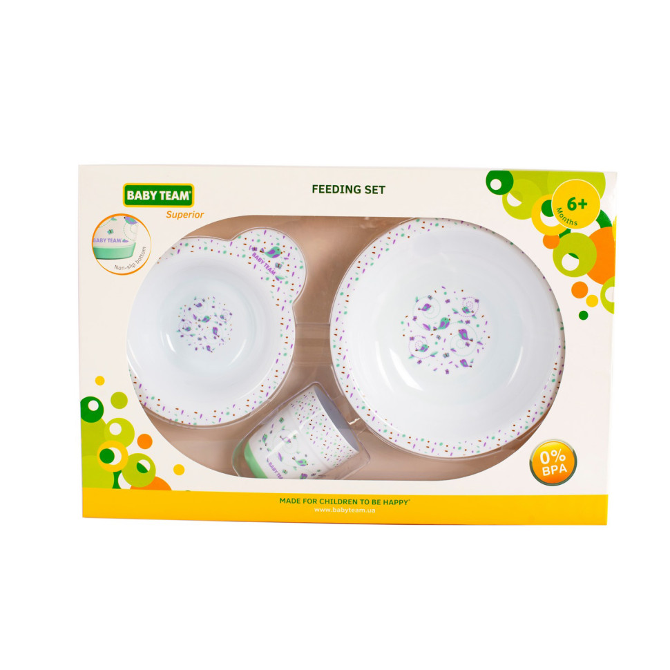 Для годування малюка віком від 6 місяців використовуйте набір Baby Team. Посуд ергономічного дизайну забезпечує комфортний і безпечний прийом їжі. Закруглена форма унеможливлює травмування, а широкий край тарілок гарантує зручність батьків під час годування. Усі предмети в наборі мають захист від ковзання. Посуд можна використовувати в мікрохвильовій печі та мити в посудомийній машині (лише верхній рівень). Вироби не містять бісфенолу А та інших шкідливих речовин.У наборі єГлибока миска для рідких блюд.Тарілка для каш і гарнірів.Чашка для напоїв.Продукти Baby Team відповідають світовим стандартам якості та безпеки.