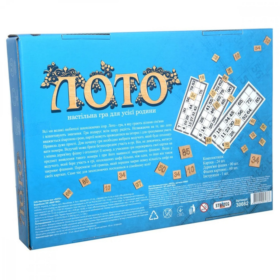 Гра "Лото з дерев'яними фішками" Strateg (30662) розвиває пам'ять і увагу. Замість звичних діжок, у цьому лото використовуються дерев'яні фішки з нанесеними номерами.