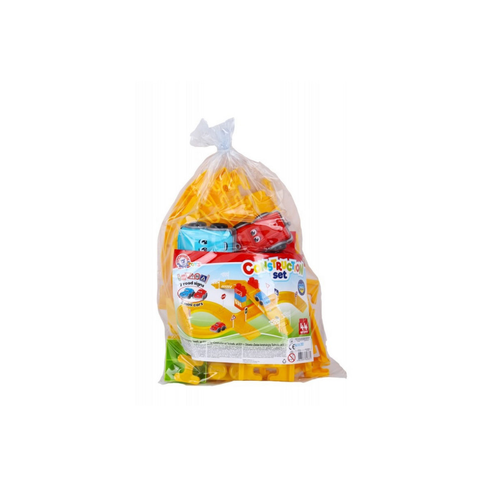 У наборі 44 елементи: дороги, конструктор машинки та дорожні знаки.