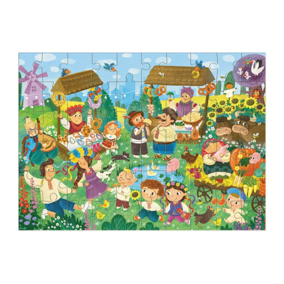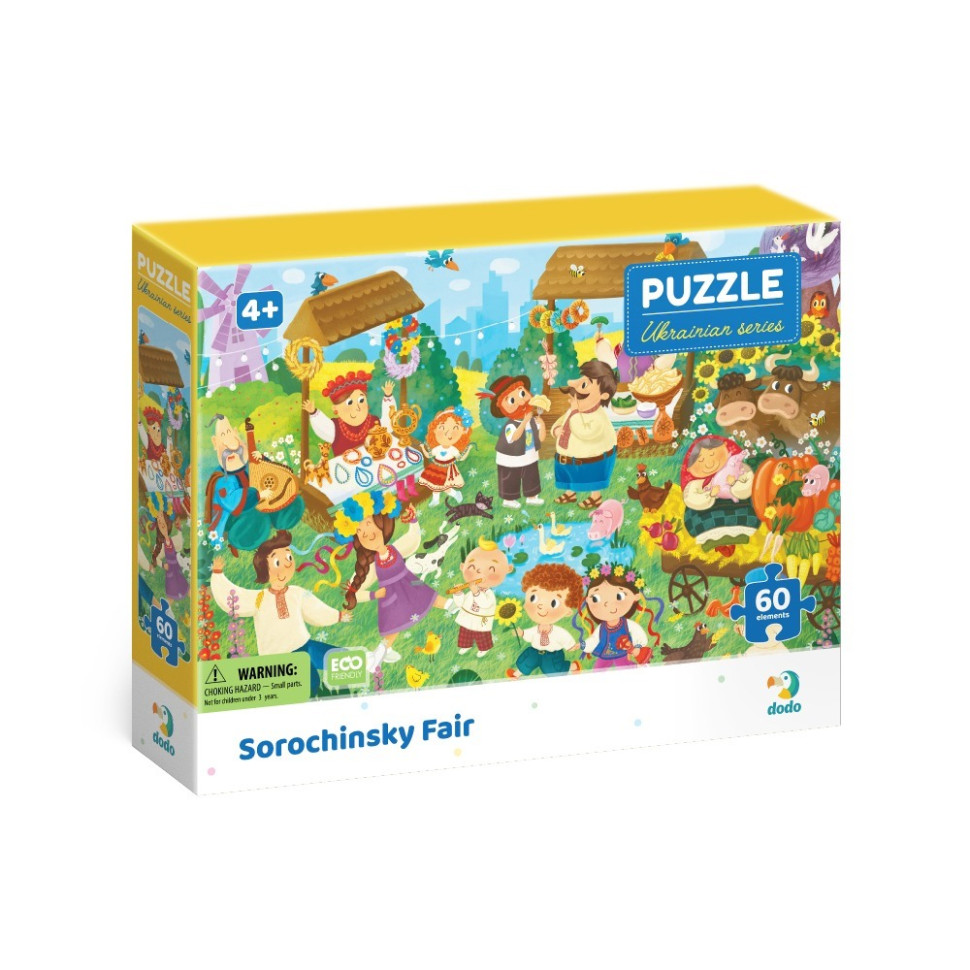 Пазл Dodo "Сорочинський Ярмарок" складається з 60 елементів і перенесе вашу дитину у яскравий світ українського ярмарку. На ілюстрації зображена колоритна сцена з найвідомішого українського ярмарку: люди у вишиванках танцюють, співають та торгують різноманітними товарами, навколо них квітнуть соняшники, гуляють тварини та панує атмосфера свята.
