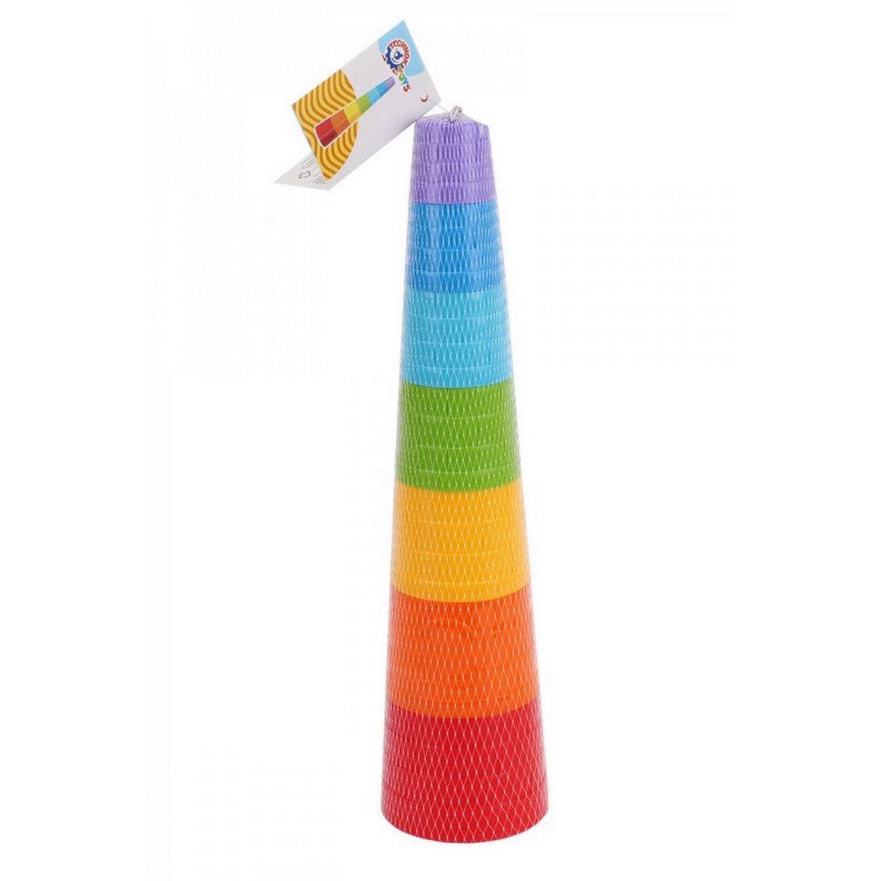 Порядок кольорів елементів, підібраний у порядку кольорів природної веселки. Завдання малюка – правильно підібрати елементи за розміром, щоб збудувати вежу.