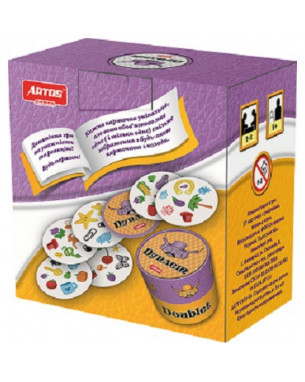 Як грати? У аналог "Дабл" грають круглими картками, на яких намальовані картинки. Картинки розділені на групи. У кожній групі є одна картинка, що збігається з картинкою на іншій картці з колоди. Мета гри - знайти картку з картинкою, що збігається, вимовити вголос, що на ній намальовано і забрати собі, як переможний трофей. - картонна коробка-упаковка - 56 круглих карток - інструкція з правилами гри.