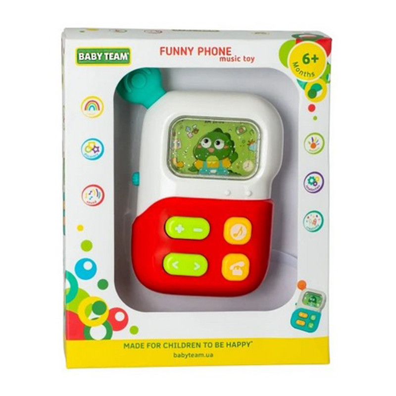 BABY TEAM Іграшка музична у вигляді телефону зі світловим ефектом приверне увагу малюка та зачарує різноманітними мелодіями та звуками. Музична іграшка розвиває координацію рухів, концентрацію, увагу, дрібну моторику, слух та колірне сприйняття. Необхідно ААА х 2 батарейки (входять в комплект лише для демонстрації функцій). Іграшки BABY TEAM виготовлені з високоякісних і безпечних матеріалів, а також не містять шкідливих речовин і Бісфенол А.