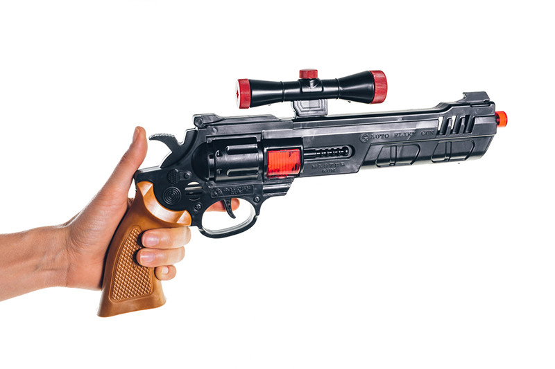 Пістолет з оптикою працює з механічним обертовим диском всередині, який створює звук і іскри, довжина - 37 см, висота - 16 см.