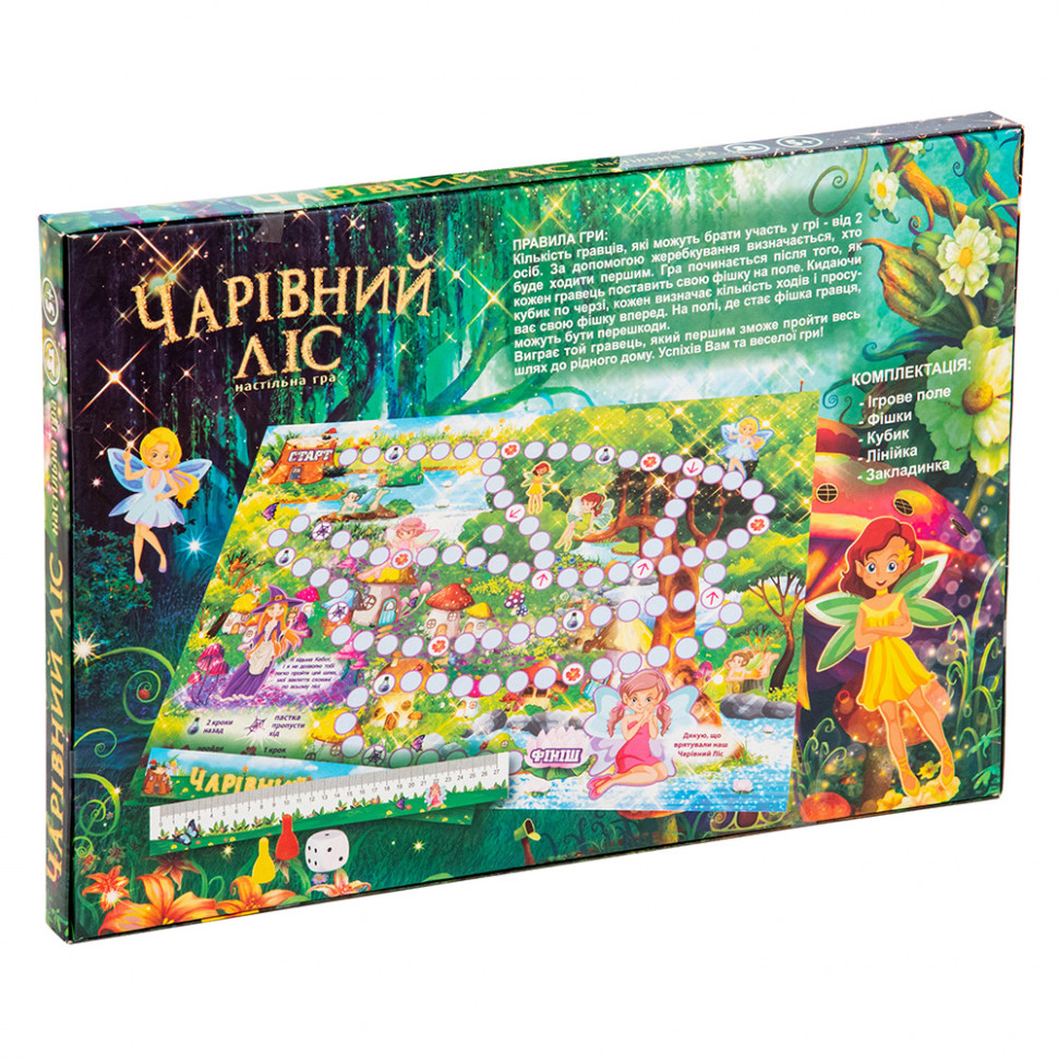 Чарівний ліс, в якому живуть маленькі крилаті феї, хоче захопити зла чарівниця Кебот - малюк повинен допомогти ельфам захистити своє житло - це сюжет настільної гри «Чарівний ліс» (Strateg 30215). Гра для компанії до 4 осіб - зможе зацікавити не тільки дітей, а й дорослих, дасть можливість цікаво провести час всій родині, при цьому розвинути уважність, проявити свої знання і розважитися. Відповідно до очками, випали на кубику, гравці пересувають фішку на ігровому полі, на якому є багато завдань і підказок, які роблять гру ще цікавіше. Ігрове поле прикрашене барвистими малюнками із зображеннями краєвидів чарівного лісу і його мешканців. В процесі гри необхідно виконати завдання, подолати перешкоди, розгадати загадки і дати правильні відповіді. Виконав завдання може пересунути свою фішку. Перемагає той, хто першим прийде до фінішу і виконає завдання з порятунку фей! Правила прості, але гра захопить учасників з першої партії. Додатковий бонус - в комплекті є лінійка і закладка, виконані в стилістиці гри. Розмір ігрового поля 21 х 29 см. Мова українська.
