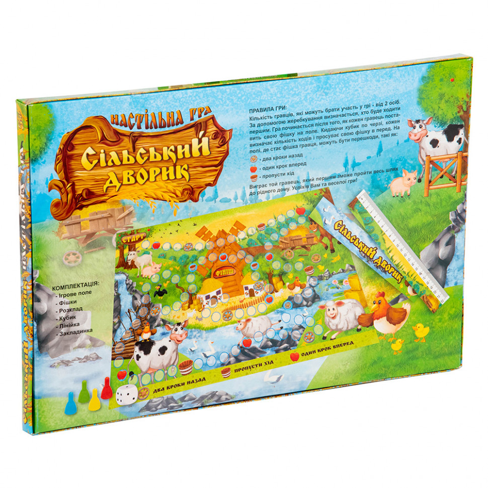 Кумедні пригоди з різними мешканцями ферми чекають малюка в настільній грі «Сільський дворик» (Strateg 30503). Гра для компанії до 4 осіб - зможе зацікавити не тільки дітей, а й дорослих, дасть можливість цікаво провести час всій родині, при цьому розвинути уважність, проявити свої знання і розважитися. Відповідно до очками, випали на кубику, гравці пересувають фішку на ігровому полі, на якому є багато завдань і підказок, які роблять гру ще цікавіше. Ігрове поле прикрашене барвистими малюнками із зображеннями різних домашніх тварин і сільських пейзажів. В процесі гри необхідно виконати завдання і подолати перешкоди. Виконав завдання може пересунути свою фішку. Перемагає той, хто першим прийде до фінішу! Правила прості, але гра захопить учасників з першої партії. Додатковий бонус - в комплекті є лінійка і закладка, виконані в стилістиці гри. Розмір ігрового поля 21 х 29 см. Мова українська.
