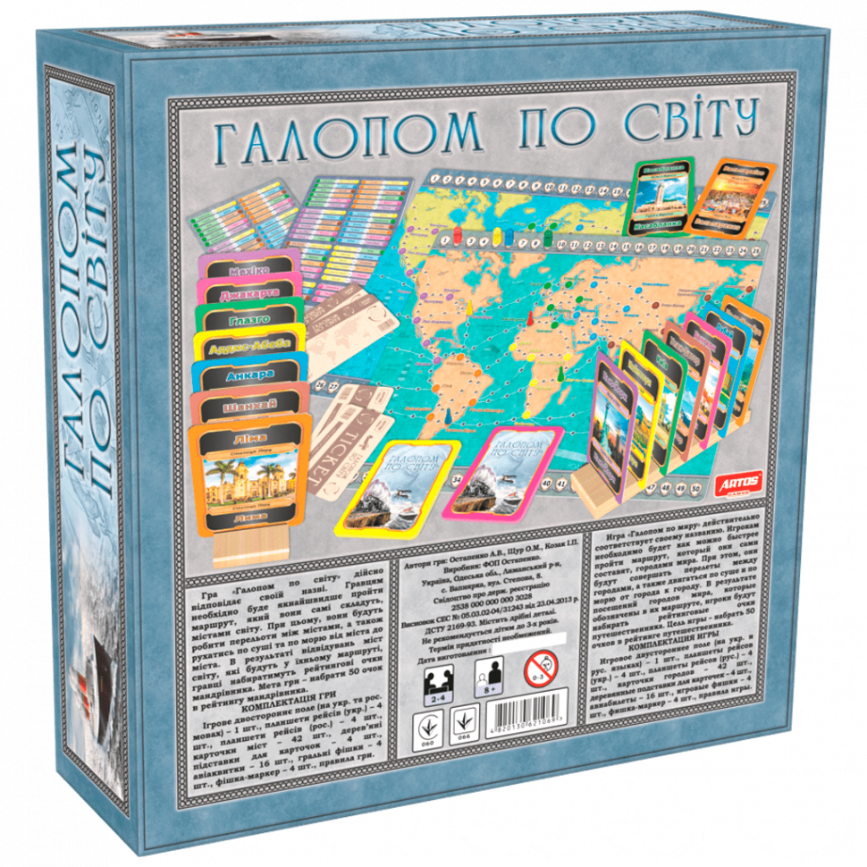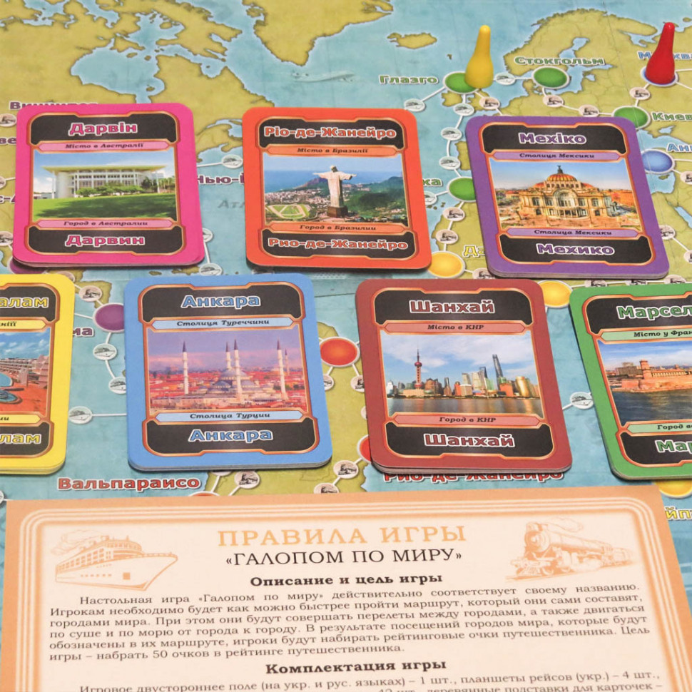 Настільна гра «Галопом по світу» дійсно відповідає своїй назві. Гравцям необхідно буде якомога швидше пройти маршрут, який вони самі складуть, містами світу. При цьому вони будуть здійснювати перельоти між містами, а також рухатися по суші і по морю від міста до міста. В результаті відвідувань міст світу, які будуть в їхньому маршруті, гравці будуть набирати рейтингові очки мандрівника. Мета гри - набрати 50 очок в рейтингу мандрівника.