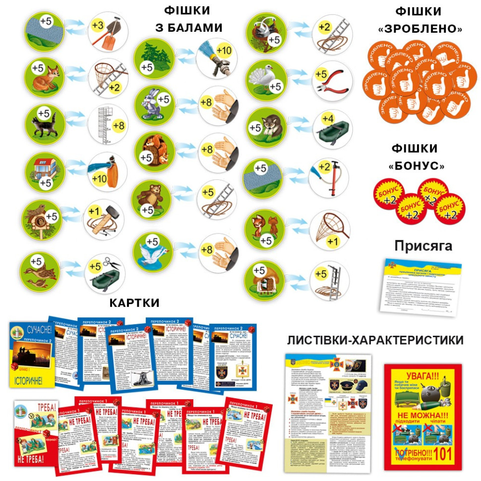 фішки «БОНУС» – 4, тематичні картки з цікавою інформацією – 12, листівки – 2, присяга – 1, кубик – 1, правила гри