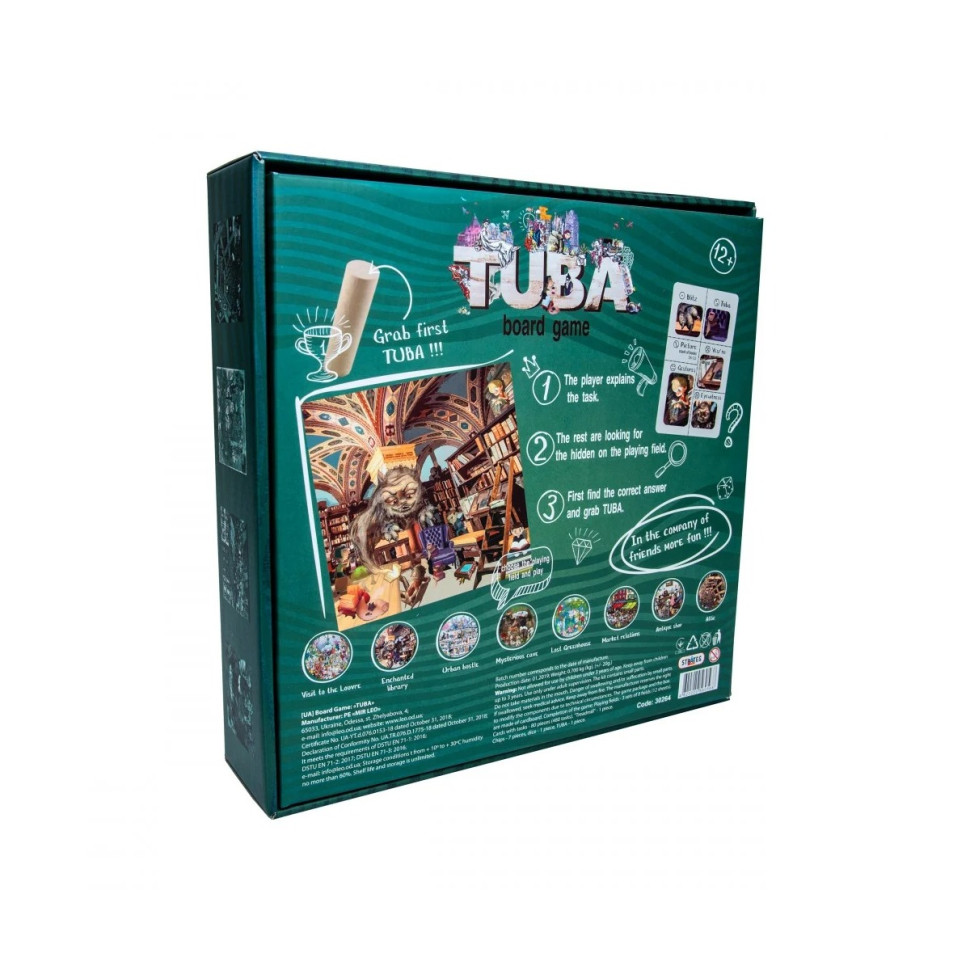 ♦ Комплект: 80 карток, 7 фішок, 12 ігрових полів, бігова доріжка, дерев'яна туба, кубик, інструкція.