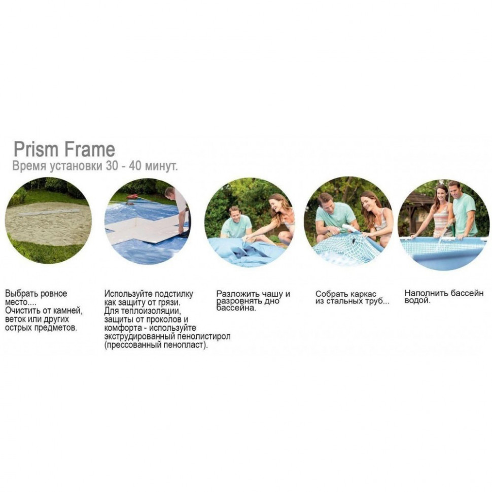 Збірний каркасний басейн серії Intex Prism Frame прямокутної форми. Запатентована технологія SUPER-TOUGH забезпечує надійність і довговічність басейну. Стінки басейну зроблені з трьох окремих особливо міцних шарів: два шари щільного вінілу і один - поліестр для особливої міцності. Підтримці форми басейну Prism Frame Pool сприяє стрічка з поліпропілену, «оперізує» весь басейн. Також міцність басейну Prism Frame Pool обумовлюється його сталевим каркасом, завдяки якому басейн витримує великі навантаження, в ньому одночасно можуть купатися кілька людей. Не потребує підготовки грунту, насипанні піску і т.п., все, що потрібно, це плоска, горизонтальна площадка.