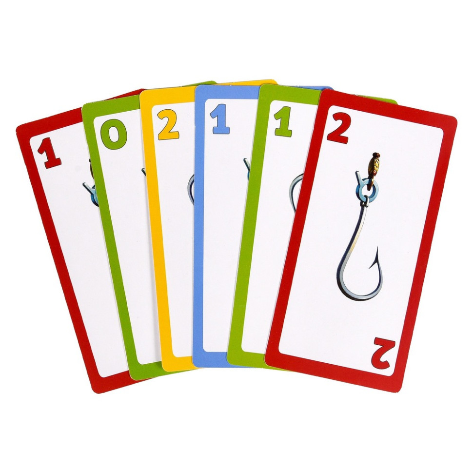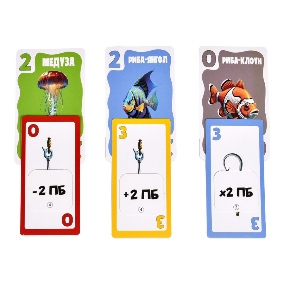 ♦ Комплектація: картки риби - 60 шт., картки наживки - 40 шт., жетони - 58 шт., картки-підказки - 4 шт., жетон головного гравця, інструкція.