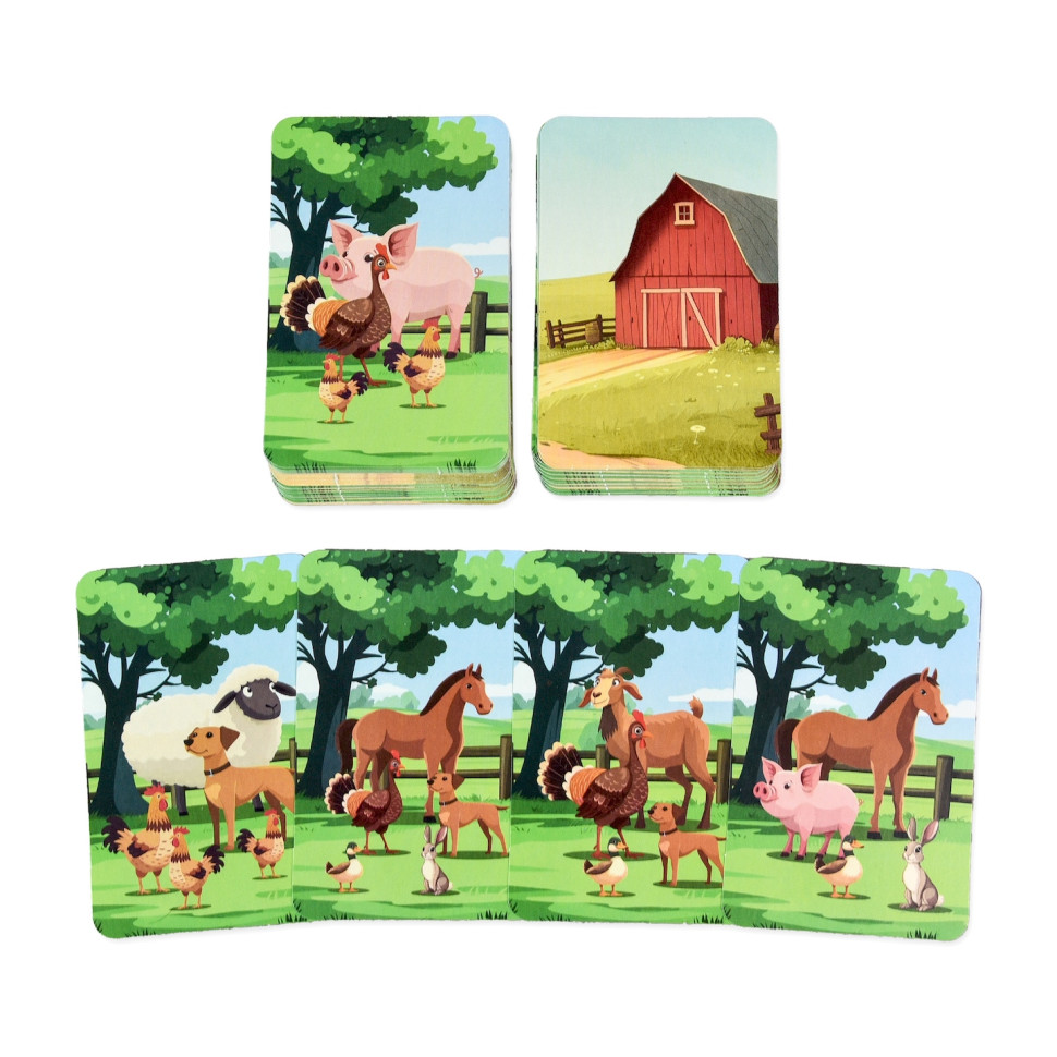 «Моє господарство» – це веселий квест для спритних та уважних гравців. Для початку захоплюючого змагання розподіліть картки на дві колоди: до першої віднесіть картки із зображенням груп тварин, до другої – з окремими звірями.