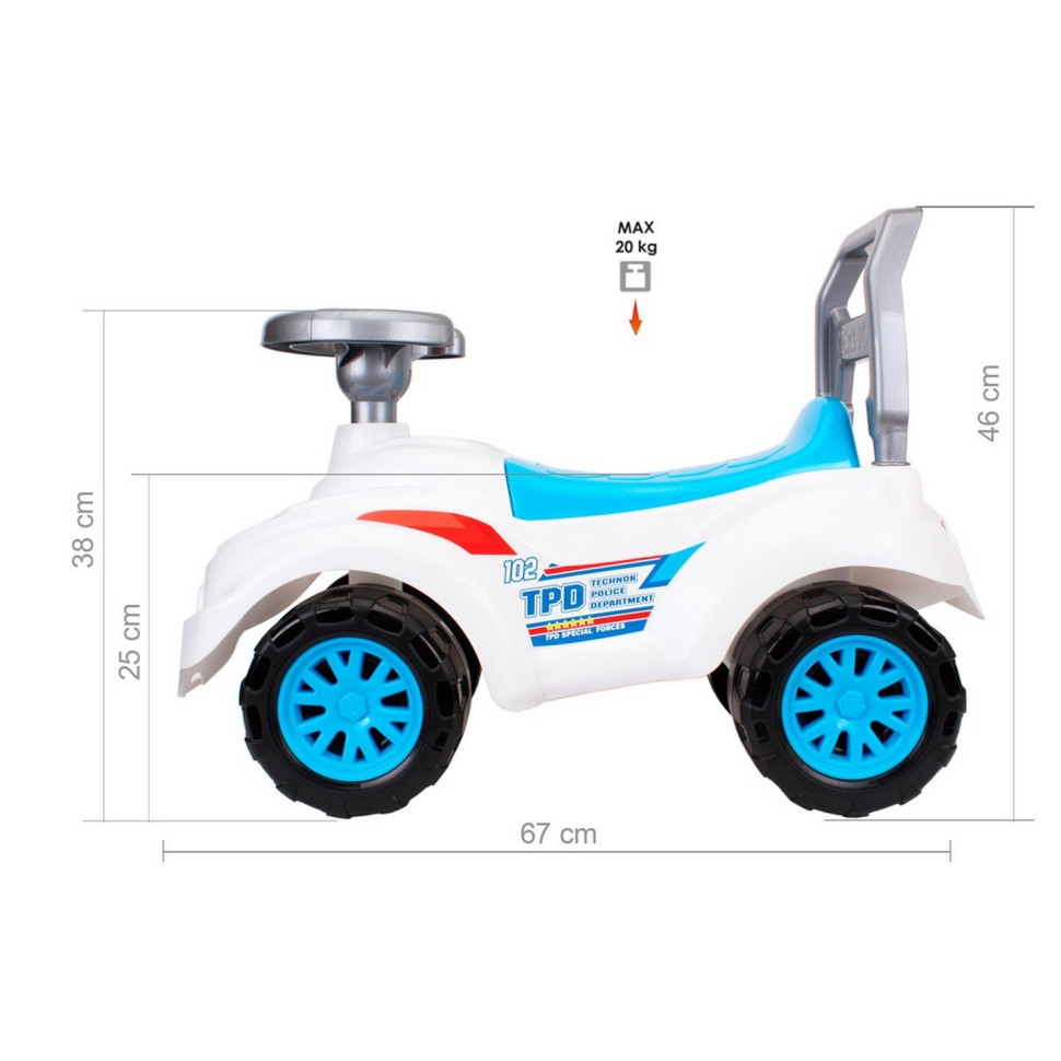 Яскраві кольори, цікаві стильні наклейки та ергономічний дизайн привернуть увагу батьків та неодмінно сподобаються малюкам. Автомобіль надійний, міцний, практичний та зручний. Для перевезення всіх потрібних речей розроблено великий багажний відсік під сидінням. Спинка надає додаткову підтримку для дітей під час їзди. На кермі є сигнальна кнопка для оповіщення пішоходів. Так їзда на автомобілі набуває максимальної реалістичності.