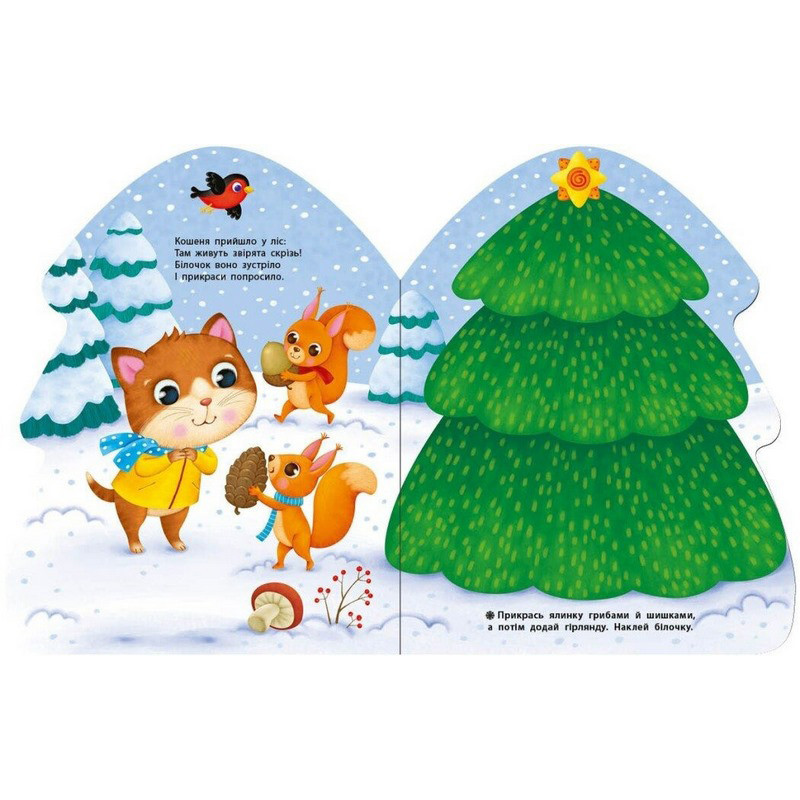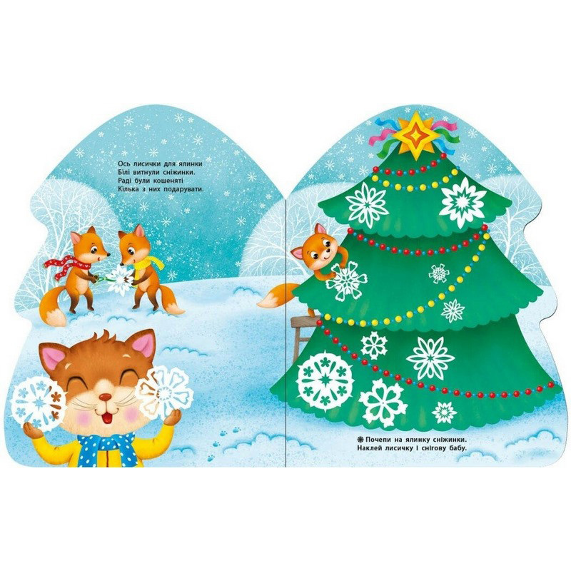 Серія «Наліпки для найменших» — це одночасно і книжка-іграшка у формі ялинки чи будиночка, і веселе святкове дозвілля! У книжці на малюка чекає коротенька віршована історія та прості завдання з наліпками. Дорослий читає віршик і завдання, а малюк клеїть на сторінки великі, зручні наліпки. Книжки серії допоможуть розвивати мовлення, увагу, допитливість та дрібну моторику. Подаруйте собі й малюкові святковий настрій!