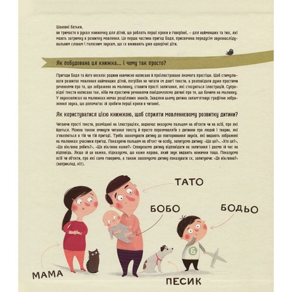 Симпатичний хлопчик Бодьо стане Улюбленим другом Вашої дитини під час його перших кроків у навчанні мови. Ця книга є Першою частиною із серії про його пригоди. У ній зосереджено увагу насамперед на звуконаслідувальні слова і голосних звуках, які вже вимовляють однорічні діти. Видання також рекомендовано для роботи з дітьми, які спізнюються в розвитку мови. Спеціально спрощена за формою і одночасно багата на гарні ілюстрації, що заохочують називати об'єкти і повторювати звуки, книга природним чином сприяє мовному розвитку дитини. Автор книги березня Галевська-Кустрьо - логопед, дитячий педагог, творчий педагог.