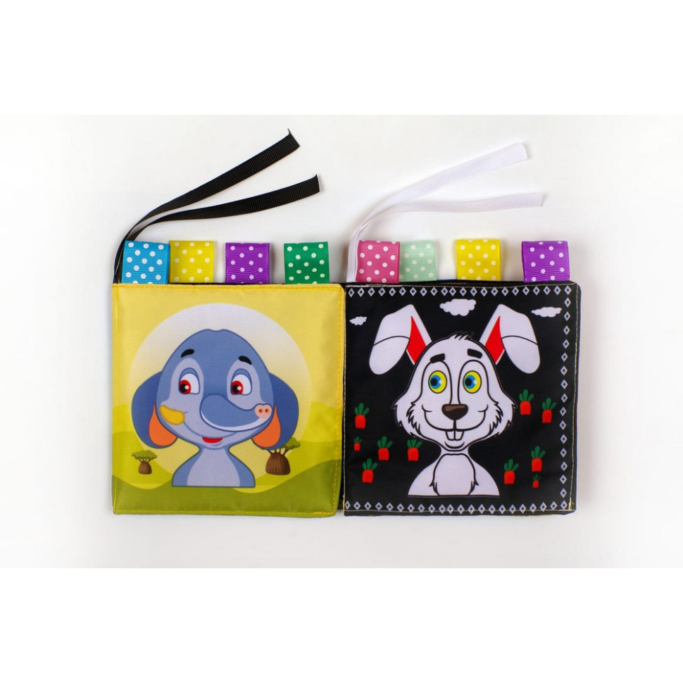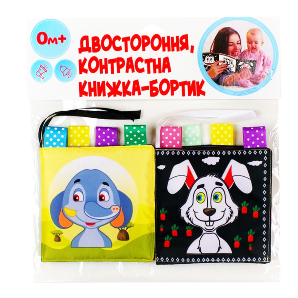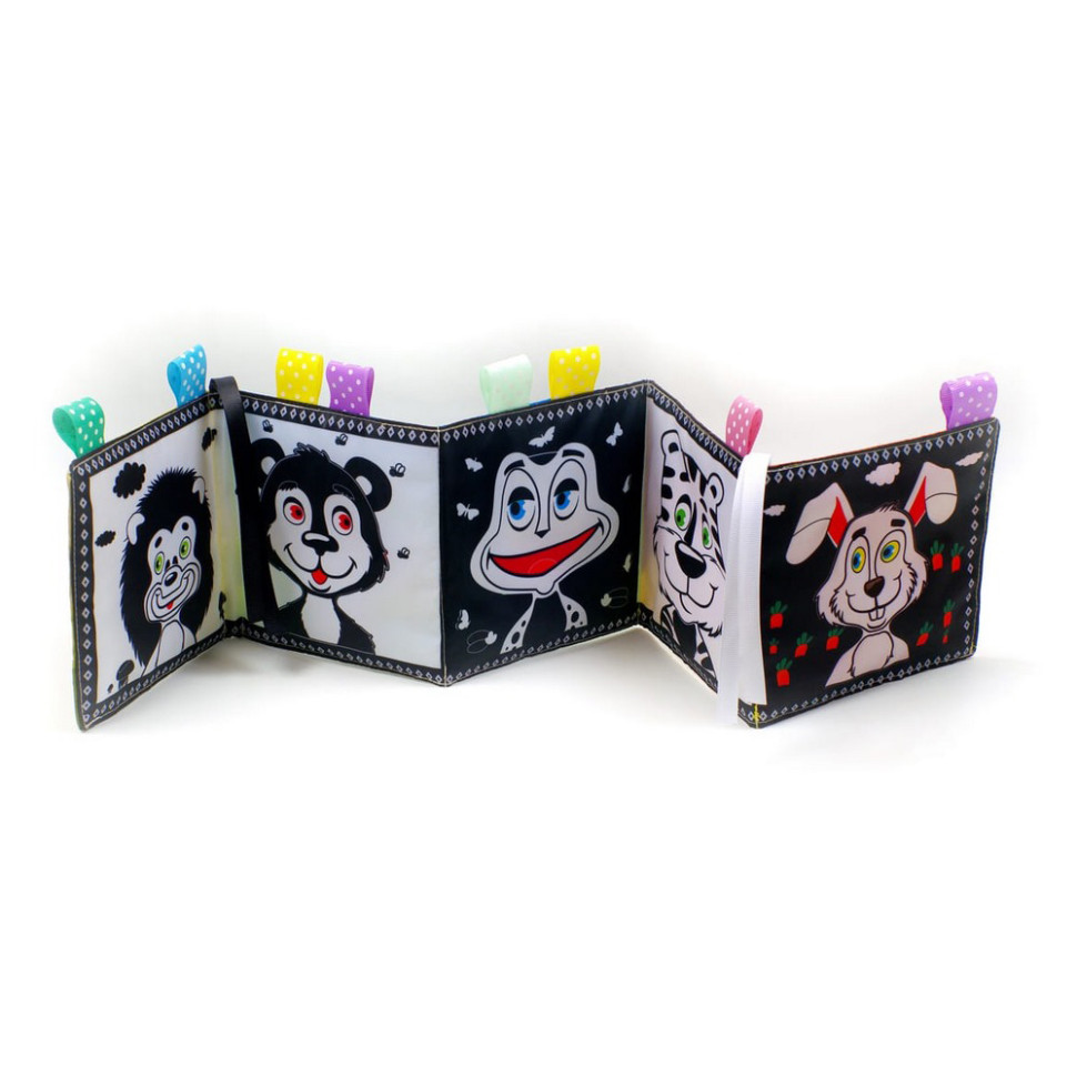 Перша сторона чорно-біла, для найменших дітей від 0 до 3 місяців. На ній розташовані контрастні зображення з однією великою картинкою в центрі, щоб малюк міг на ній сфокусуватися та уникнути зайвої стимуляції