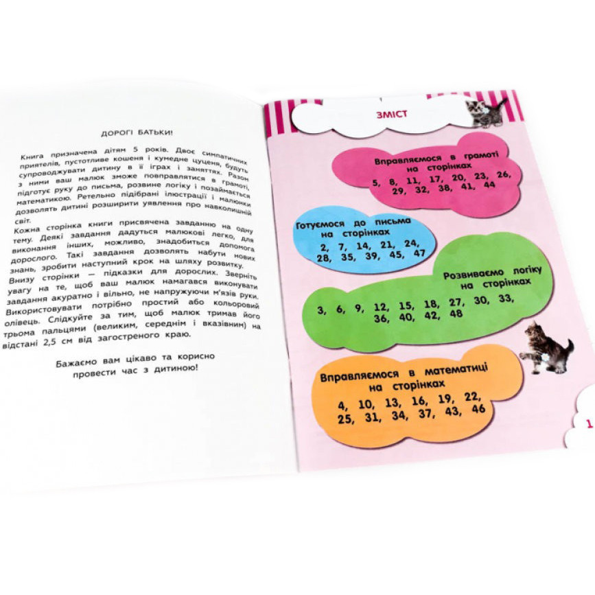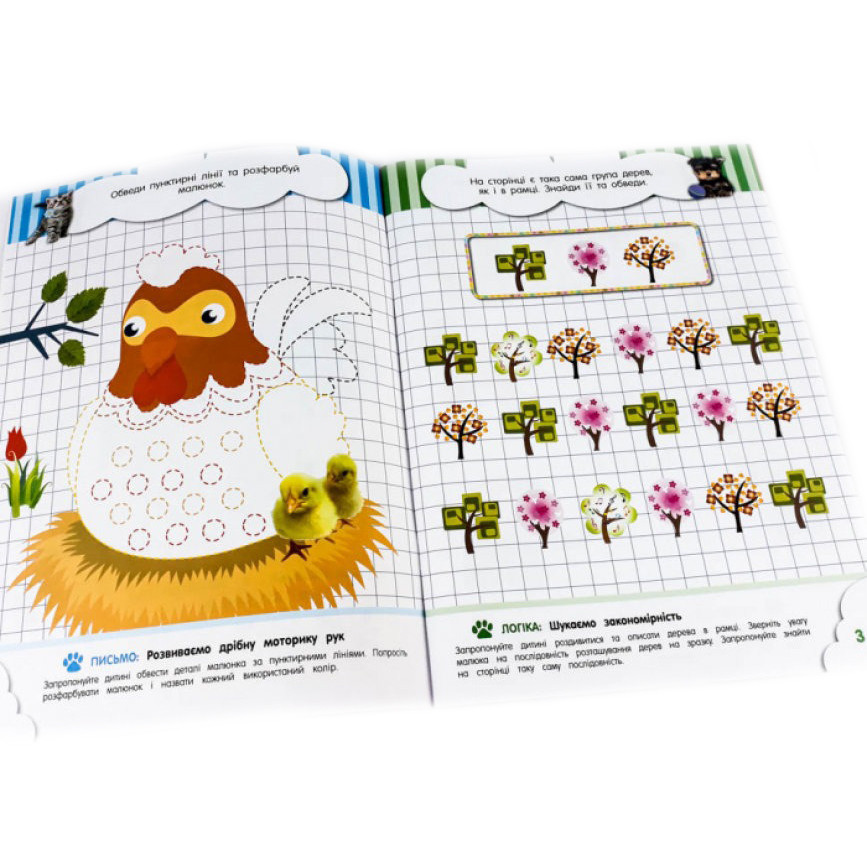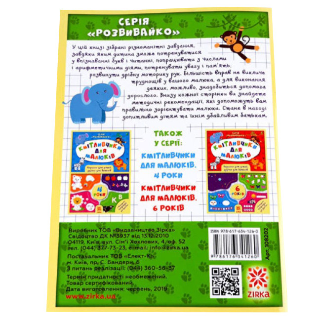 Серія книг з розвиваючими завданнями для дошкільнят. Кожна книга серії орієнтована на певний вік (4, 5 або 6 років) і відповідає освітній програмі МОН України «Дитина». Одна сторінка - одна задача, яскраві малюнки і цікаві вправи. Внизу кожної сторінки розташовані методичні рекомендації, які допоможуть дорослому правильно зорієнтувати дитину. У цій книзі є всі типи завдань, необхідних для розвитку дитини дошкільного віку. Згідно освітньої програми МОН України «Дитина» ваш малюк буде робити перші кроки в розпізнаванні букв і читанні, вивчить або згадає числа і виконає завдання з ними. Корисні і цікаві ігри, наведені в цій книзі, будуть сприяти розвитку дрібної моторики рук вашої дитини. Більшість завдань малюк зможе виконати сам. Але якщо йому буде складно, то допоможуть підказки від батьків!