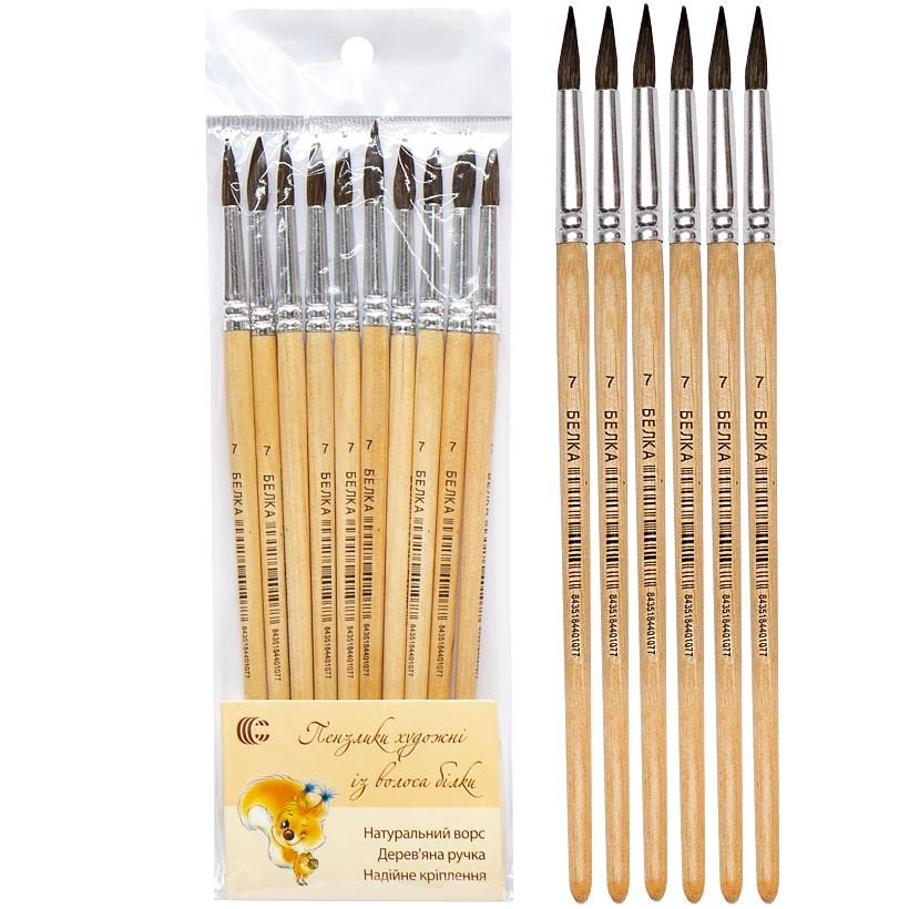 Пензлик художній Білка №7 виготовлений з натурального ворсу білки. Кругла форма підходить для акварелі, гуаші та акрилових фарб. Забезпечує плавні переходи та деталізовані елементи. Натуральний ворс добре утримує вологу і пігмент. Довжина пензля – 17 см. Упаковка містить 10 штук, ціна вказана за 1 пензлик.