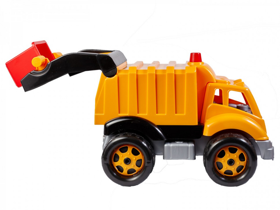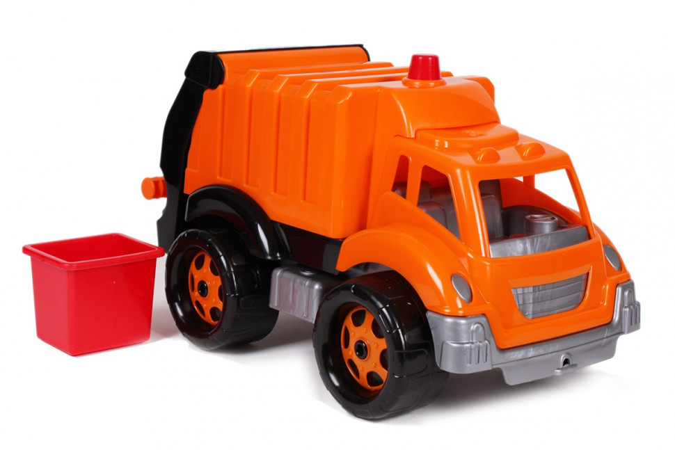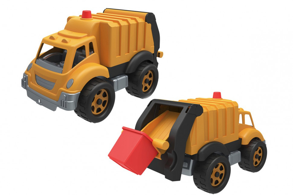 Машинка у вигляді сміттєвоза з баком для сміття і рухомою кришкою.