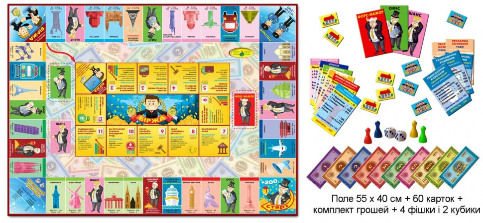 Ігрове поле (55 х 40 см) - 1, картки власності - 27 картки «Офіс», «Шанс» і «Форс-мажор» - 33, картки будинки і готелі - 56, фішки - 4, кубики - 2.