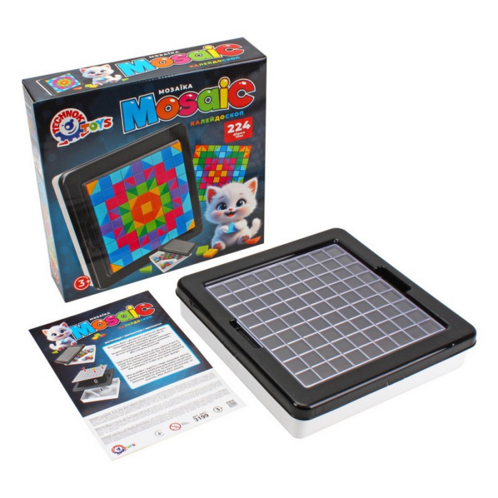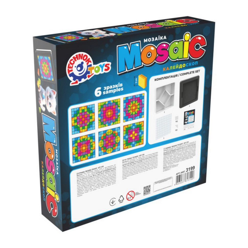 "Мозаїка ТехноК" (арт. 3199) - це запрошення у світ високого дизайну для найменших. Головна особливість набору - унікальна форма фішок. Замість традиційних круглих елементів, дитина працює з квадратами та трикутниками. Це дозволяє створювати малюнки з чіткими лініями, складними орнаментами та ефектом «піксельної графіки», що стимулює нестандартне художнє бачення та просторову уяву.