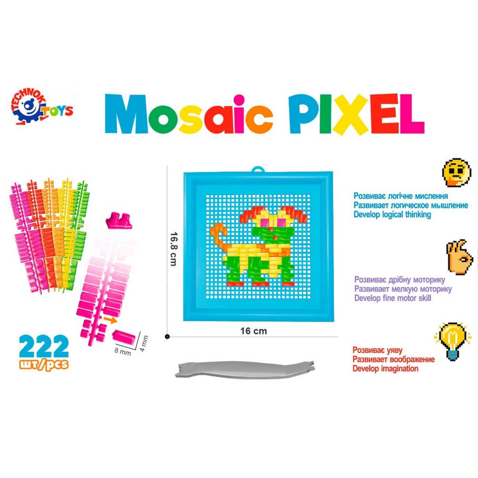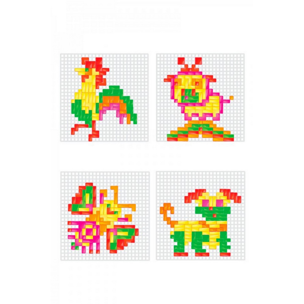 Як зібрати мозаїку? Малюнок викладається на пластикове поле дрібними фішками різних форм. Усього в комплекті 220 елементів 5-ти кольорів! Розмір найменшого квадратика 4х4 мм. На допомогу дітям є спеціальний інструмент, яким зручно виймати фішки з поля. Для юних творців у наборі є інструкція, згідно з якою можна зібрати 4 малюнки: півня, метелики, собачки та бичка.