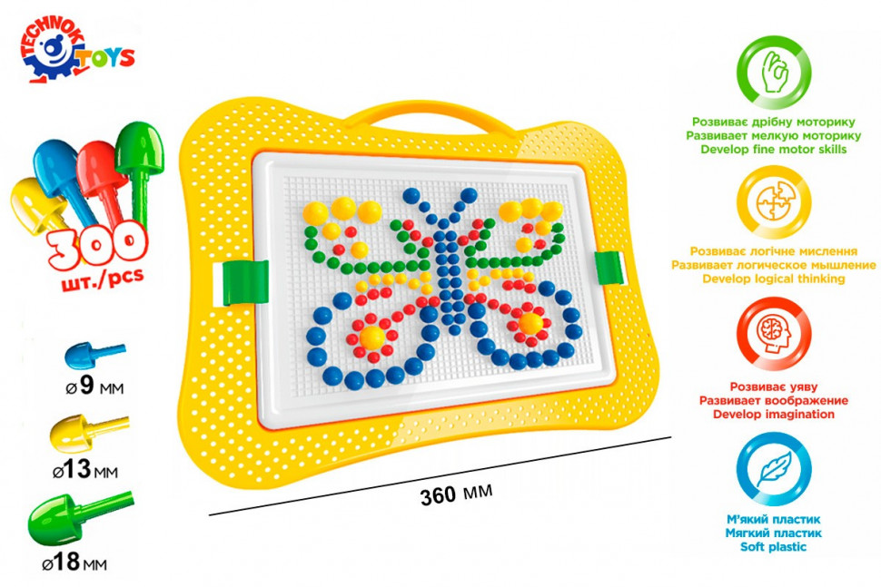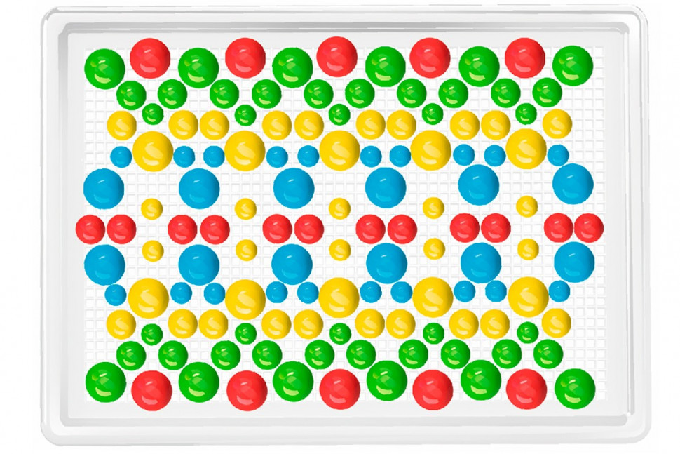 Мозаїка складається з зручного пенала-саквояжа з двома фіксаторами. Розміри фішок - 9 мм, 13 мм і 18 мм. Чотири кольори - 300 фішок.
