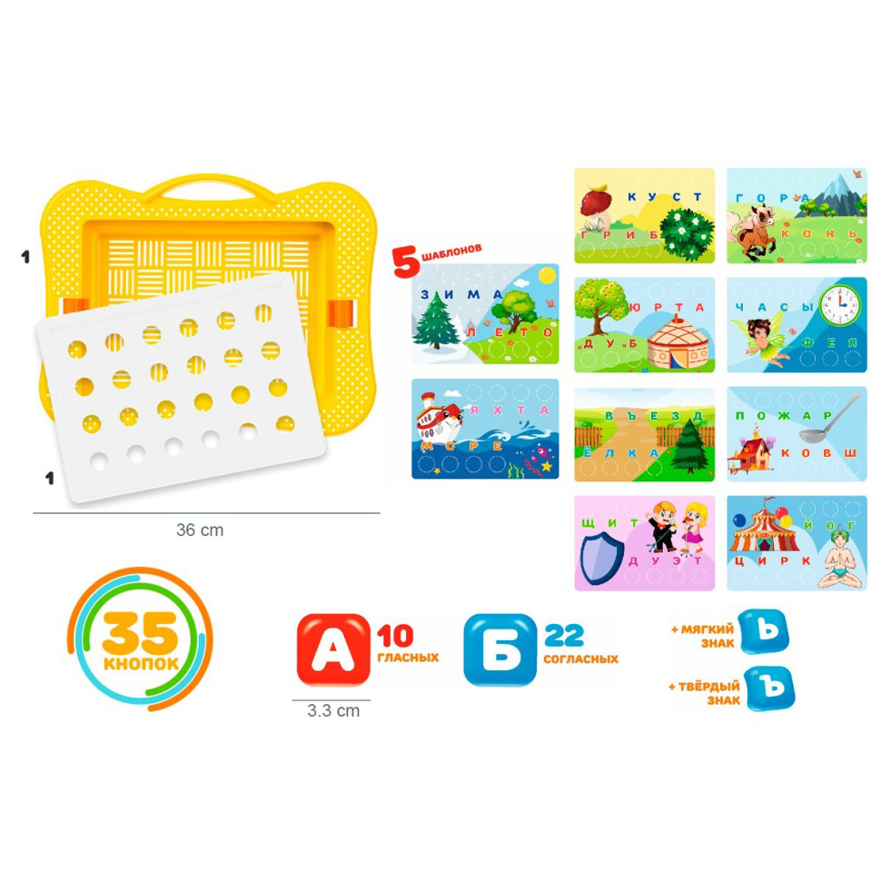 Для складання слів є 5 двосторонніх кольорових шаблонів із щільного паперу та отвори для кнопок. Під отворами підписано букви, що складаються в слова. Тематичні зображення на шаблонах – як підказка, яка допоможе малюкам швидше та краще запам'ятати слова та літери. Після оволодіння всіма словами на картинках, дітки також можуть становити самостійно нові слова одразу на полі.