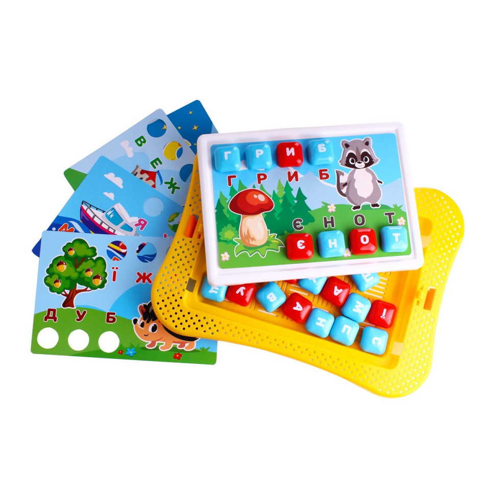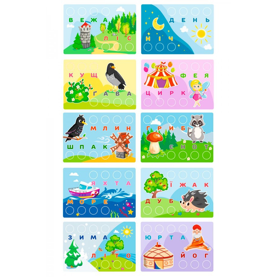 Для складання слів є 5 двосторонніх кольорових шаблонів із щільного паперу та отворами для кнопок. Під отворами підписано букви, що складаються в слова. Тематичні зображення на шаблонах - як підказка, яка допоможе малюкам швидше та краще запам'ятати слова та літери. Після освоєння всіх слів на картинках діти також можуть становити самостійно нові слова відразу на полі.