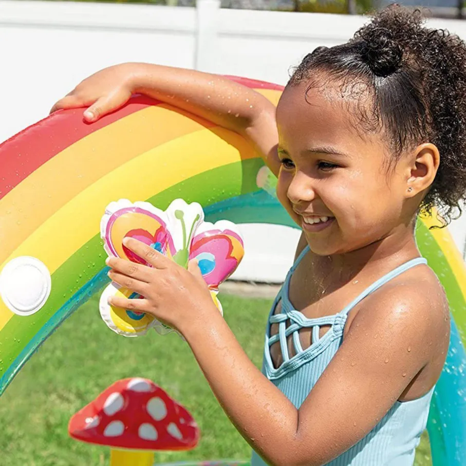 Для ще більшого задоволення від води ви можете підключити шланг до басейну так, щоб невеликі бризки води почали розпорошуватися з веселки. Крім того, в ігровому центрі передбачено кілька розваг, таких як метання м'яча (набір включає 3 ігрових м'яча) і надувні метелики, і гриби.