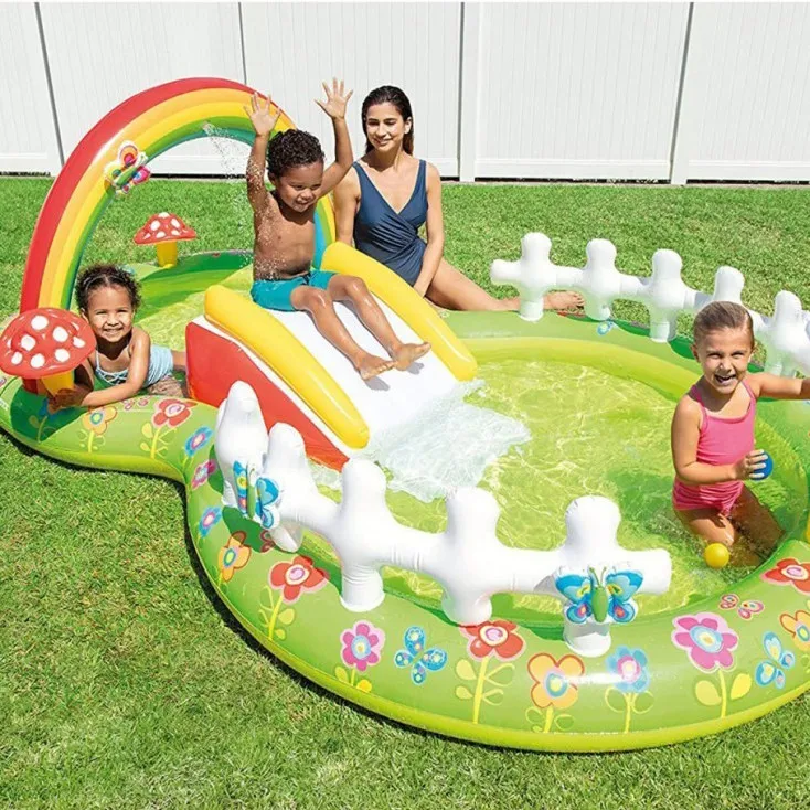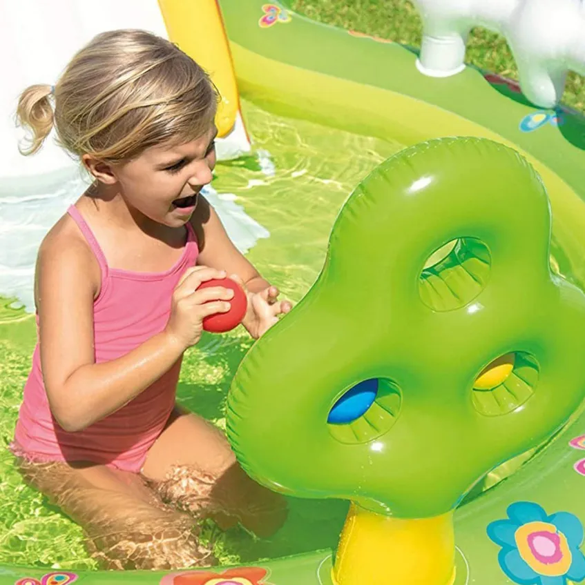Ігровий центр "Мій сад" Intex 57154 з садовим дизайном - справжній водний рай для вашої дачної ділянки! Весела ігрова площадка - це набагато більше, ніж просто надувний басейн. Два басейни, гра в м'яч, бризки води і ще водна гірка.