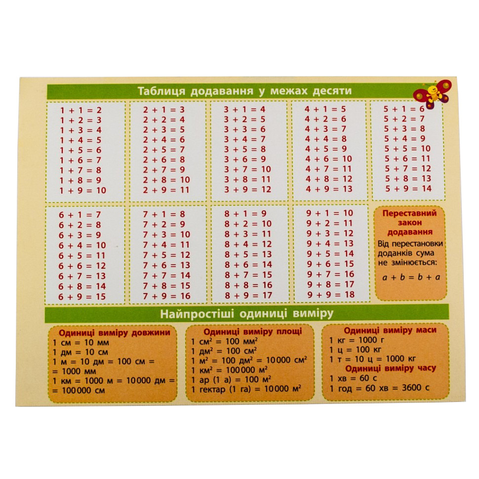 Картонка-підказка містить приклади, визначення та схеми з математики. Вона стане незамінним помічником для учнів початкової школи з математики та школярів Нуш під час уроків і вдома.