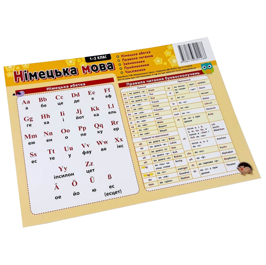 Картонка-підказка містить основні правила, визначення та схеми з німецької мови, які стануть основою для подорожі школяра в світ знання іноземної мови. Вона стане незамінним помічником для учнів 1-2 класів або старших школярів, які починають вчити другу іноземну мову, на уроках і вдома.