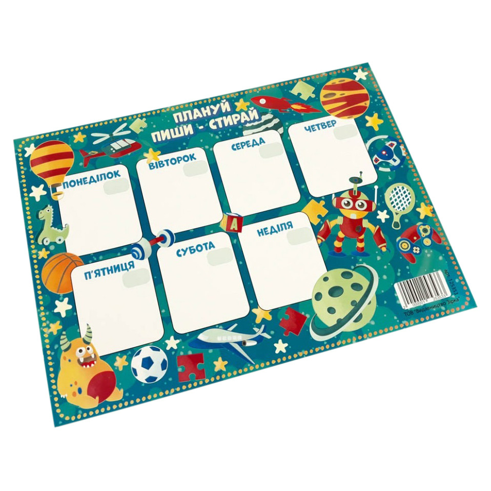 Планер «Плануй-пиши-стирай» - наша допомога в плануванні вашого тижня! Зроблено саме для того, щоб ви могли планувати, корегувати свої плани, стираючи написи і додаючи нові, планер допоможе пам'ятати про всі важливі моменти вашого життя і нічого не пропустити. Планер має зручний формат, його можна закріпити на холодильник за допомогою магнітів, розмістити в зручному місці на столі або там, де він має 100% бути. Виконано в зеленому кольорі, - має відповідне покриття, по якому можна писати маркером або фломастером. Прати написане можна сухим шматком тканини, губкою або серветкою. Розмір: 230 х 170 мм.