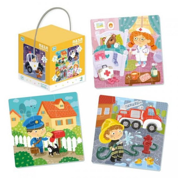Пазл 4 в 1 "Професії" української ТМ Додо в подарунковій об'ємній коробці-кубі з ручкою.