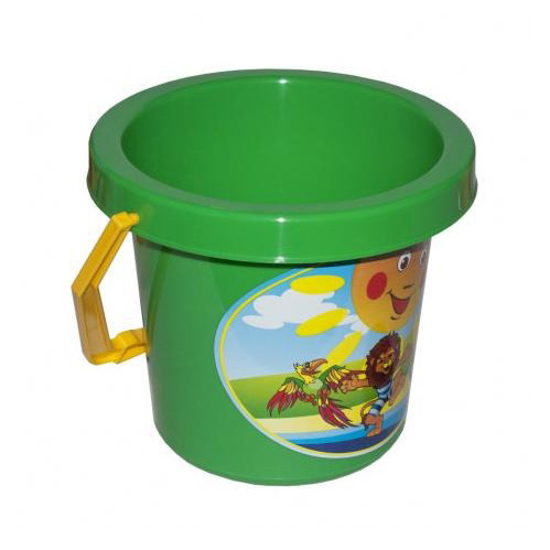 Відерце прикрашене яскравою наклейкою з цікавим малюнком. "Відерко" зручно брати з собою на прогулянку в колясці або сумці на пляж, у пісочницю поряд з будинком та дитячим садком. Його легко помити після ігор із піском і знову грати вдома.