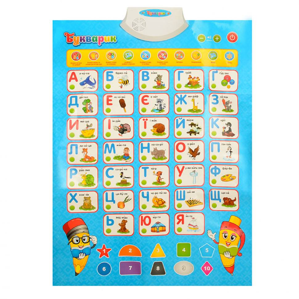 Інтерактивний плакат 7031 UA допоможе в невимушеній атмосфері гри вивчити букви і слова, звуки голосні /приголосні, цифри і порядковий рахунок, послухати веселі вірші і перевірити знання. Плакат розроблений за участю професійних методистів і дитячих психологів, на основі програми розвитку дитини дошкільного віку. Розвиває: пам'ять, логічне мислення, концентрацію, навички самостійного навчання.