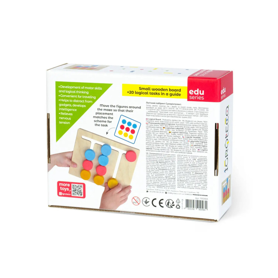 Дерев'яний логічний лабіринт - цікава гра для розвитку логіки та моторики рук для дітей 3+. Картки в наборі заохочують дитину грати самостійно та отримувати бажаний результат. Таку гру зручно брати в дорогу.
