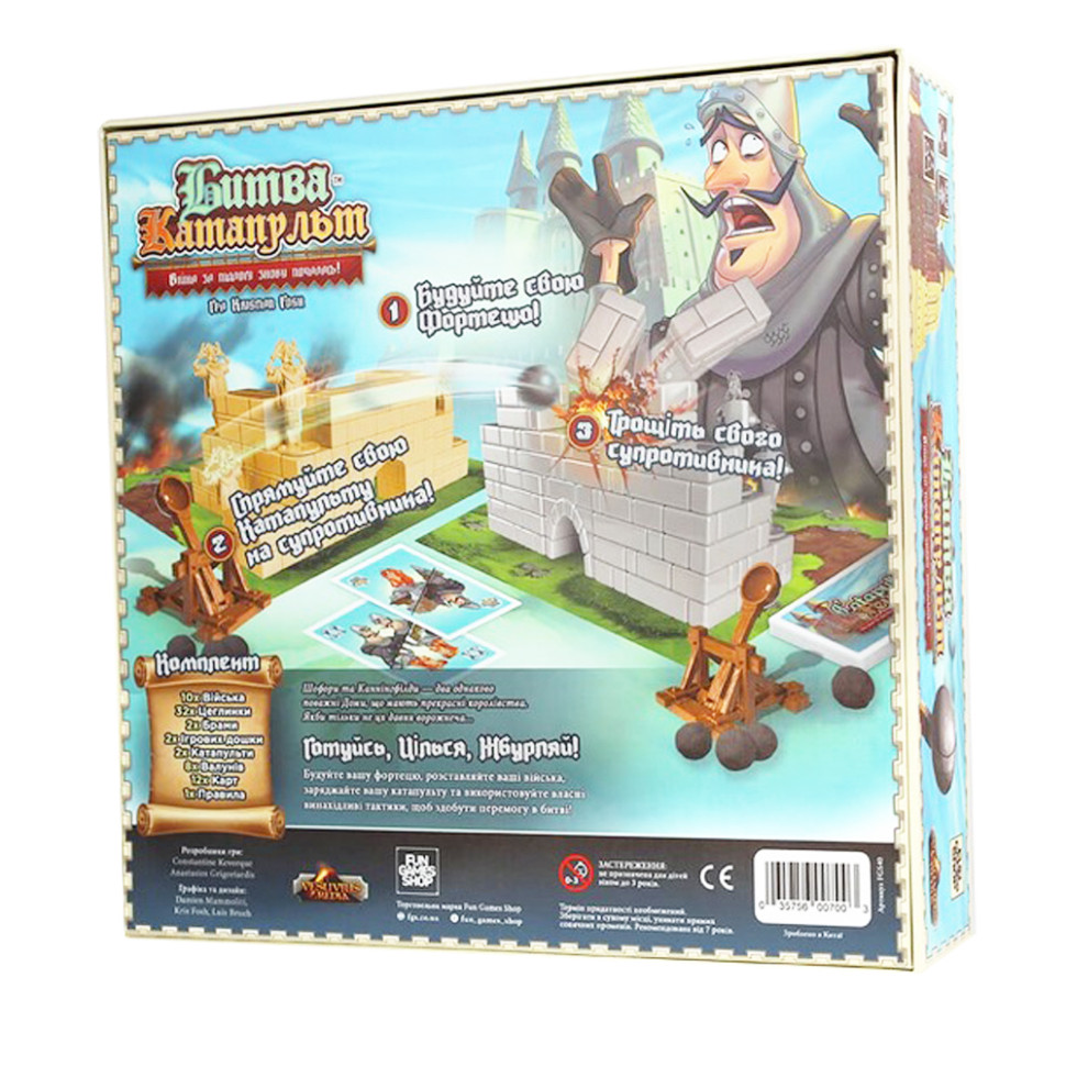 Catapult Feud («Битва Катапульт») ― настільна гра від гейм-дизайнера Крістіана Фоша, гордого батька двох синів. Мабуть, саме вони підштовхнули його до створення чудової дуельної гри про протистояння двох пластикових фортець.