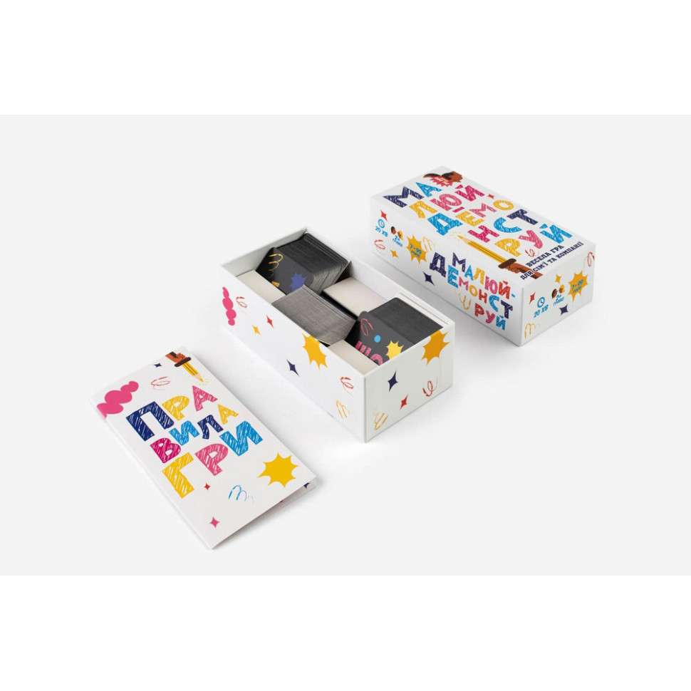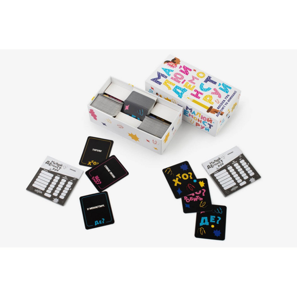 Ласкаво просимо до гри «Малюй — демонструй». Гра проста, але водночас неймовірно весела. Все, що вам потрібно робити, — це з трьох випадкових слів на карточках складати кумедні та часто абсурдні фрази, які ви будете малювати або демонструвати своїй команді та відгадувати їх за відведений час. Перед вами 3 колоди: «Хто?», «Що робить?» і «Де?». Тягніть по одній картці з кожної колоди та отримайте фразу. Наприклад, «Хто?» - «ПРЕЗИДЕНТ», «Що робить?» — «ТАНЦЮЄ», «Де?» — «В МАГАЗИНІ ІГРАШОК». Складаємо речення: «ПРЕЗИДЕНТ ТАНЦЮЄ В МАГАЗИНІ ІГРАШОК», і гра починається!