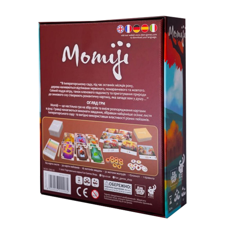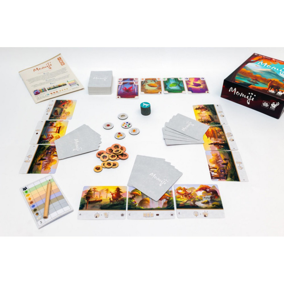 «Momiji» — це настільна гра на збір сетів та вміле розпоряджання картами в руці. Гравці намагаються виконати завдання, зібравши найцінніше осіннє листя Імператорського саду та вигідно використавши властивості різних пейзажів.