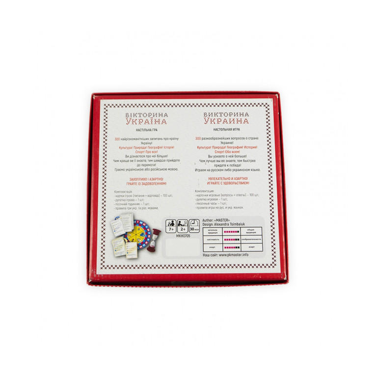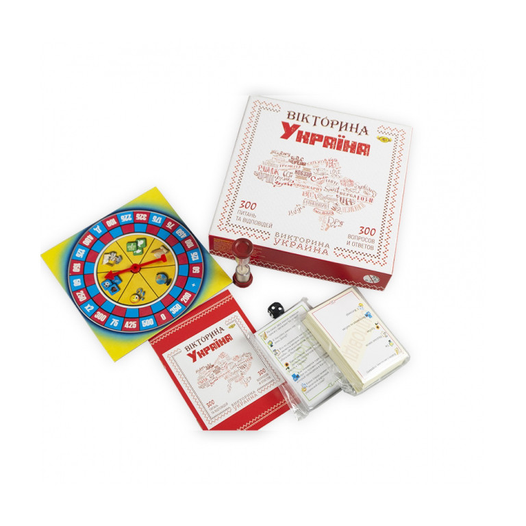 Найкраща настільна гра для маленьких та дорослих патріотів – набір «Вікторина Україна» торгової марки «Майстер». Вся родина буде у захваті. Настільна гра не тільки чудово розважає, а й допомагає дізнатися якнайбільше про батьківщину. Учасникам належить битися в ерудиції. Вікторина присвячена Україні. Тут будуть питання на різні теми: культура, географія, природа, спорт, історія. Які завдання отримає кожен конкретний учасник – це вирішує ігрова рулетка. Повертаємо її та отримуємо результат. Завдання написані на картках. Вони виготовлені з якісного міцного картону, який переживе не одну сотню ігор. Цікавих питань багато. Напевно, навіть кращим знавцям українських загадок доведеться поламати голову над деякими завданнями. Час відповіді обмежений. Його відміряють пісочний годинник, який також входить у набір. Можна влаштувати двобій для двох, або вікторину для великої компанії. Нудьгувати точно не доведеться. Грати можна українською або російською мовою