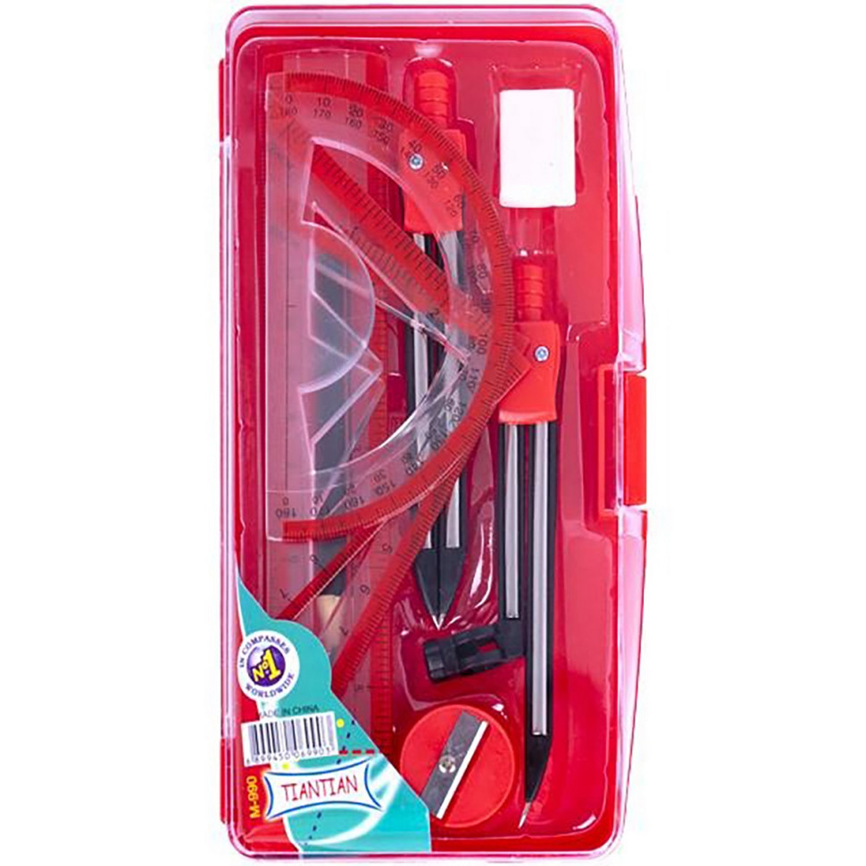 У пластиковій коробці в пластиковій коробці. У наборі циркуль, вимірювач, транспортир, лінійка, 2 трикутники. Розмір 18 х 9 см
