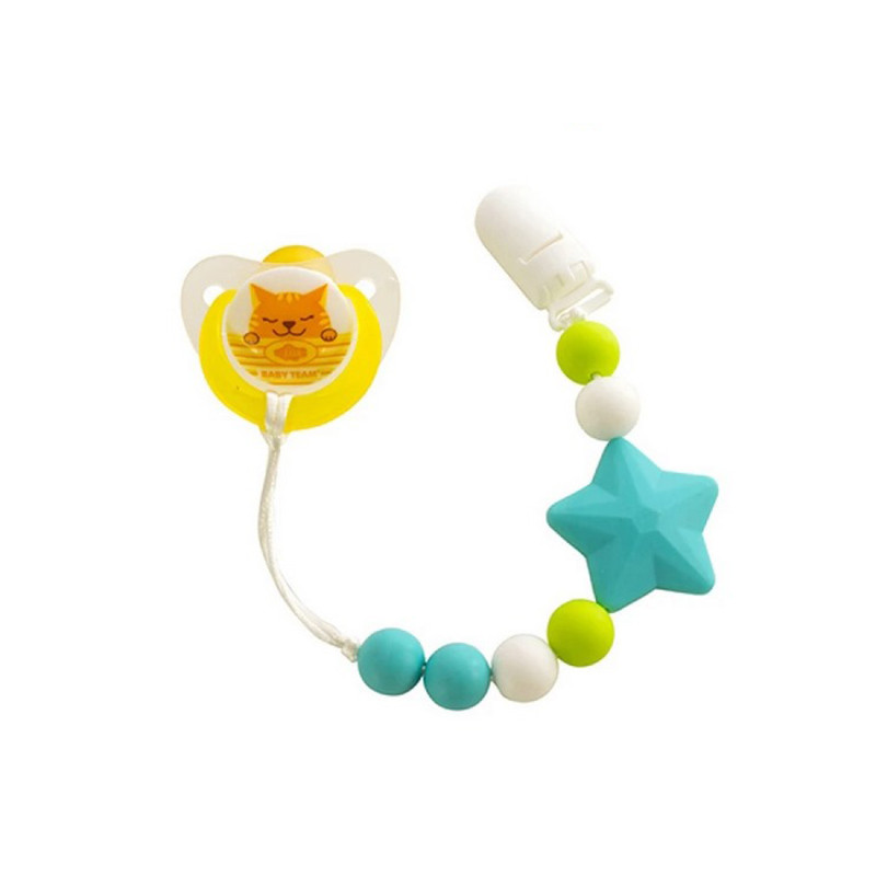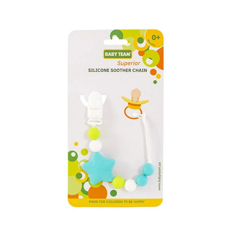 BABY TEAM Корисний аксессуар для пустушки або прорізувача стане в нагоді на прогулянках і вдома. Легко й надійно кріпиться з допомогою кліпси до одягу малюка. Допомагає не забруднити та не загубити пустушку.
