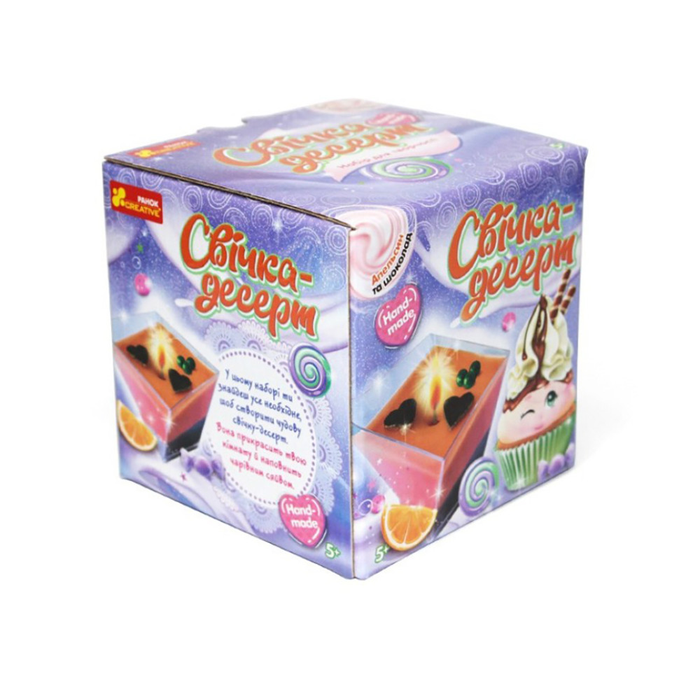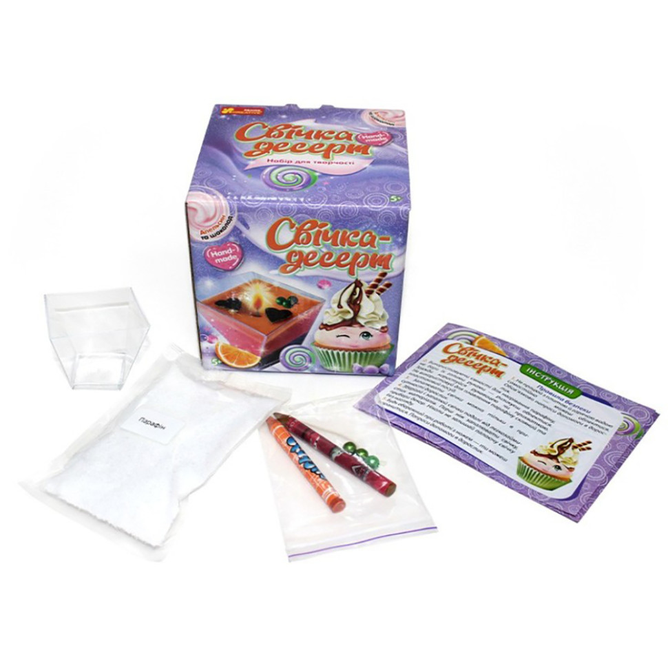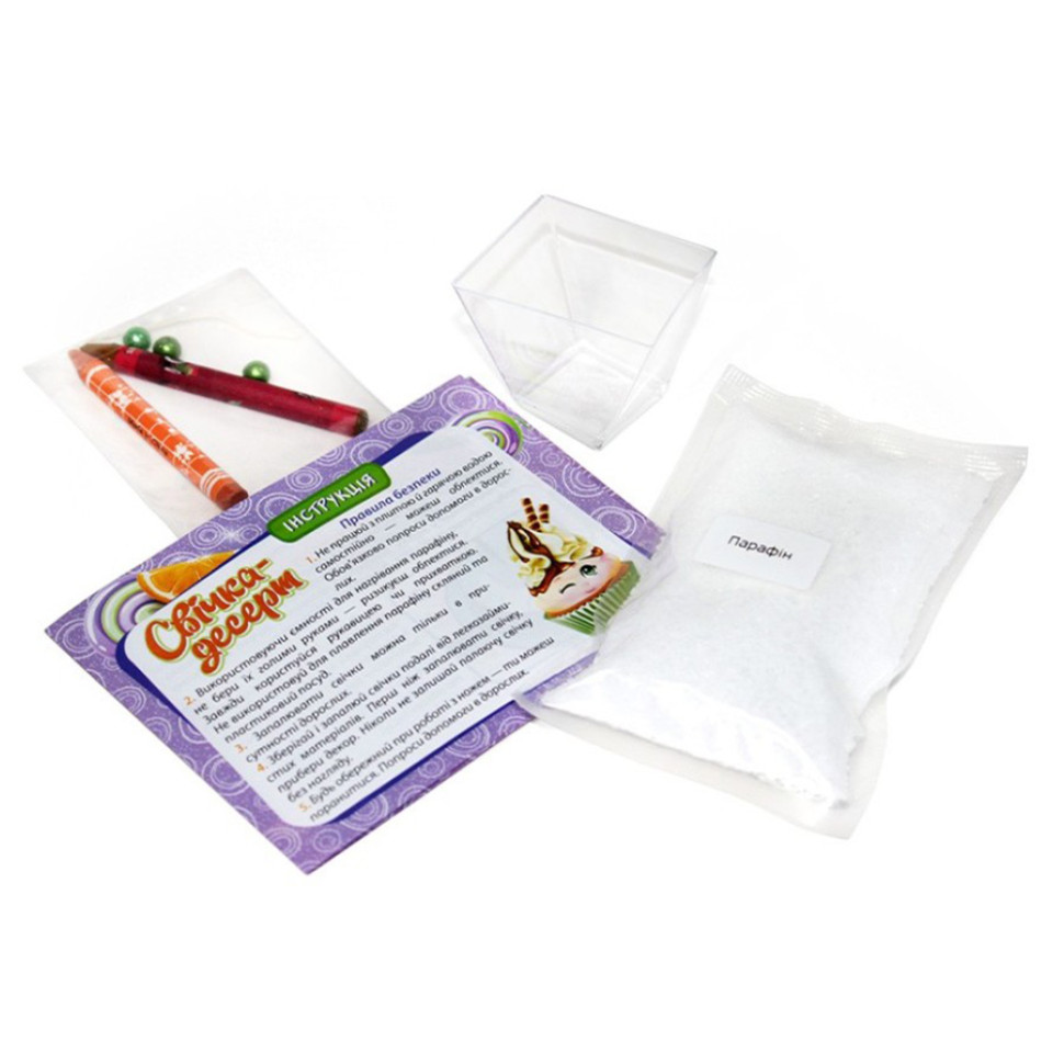 Створи свічку-десерт своїми руками! За допомогою цього набору для творчості не тільки розкриєш секрети виготовлення гелевих свічок, а й прикрасиш свій будинок! Казкова свічка у вигляді солодощів стане незвичайним подарунком для маленьких та дорослих ласунів. У цьому наборі ти знайдеш все необхідне для створення чудової свічки. Набір містить:стаканчик, парафін, гніт, барвники-олівці, намистини, покрокову інструкцію.
